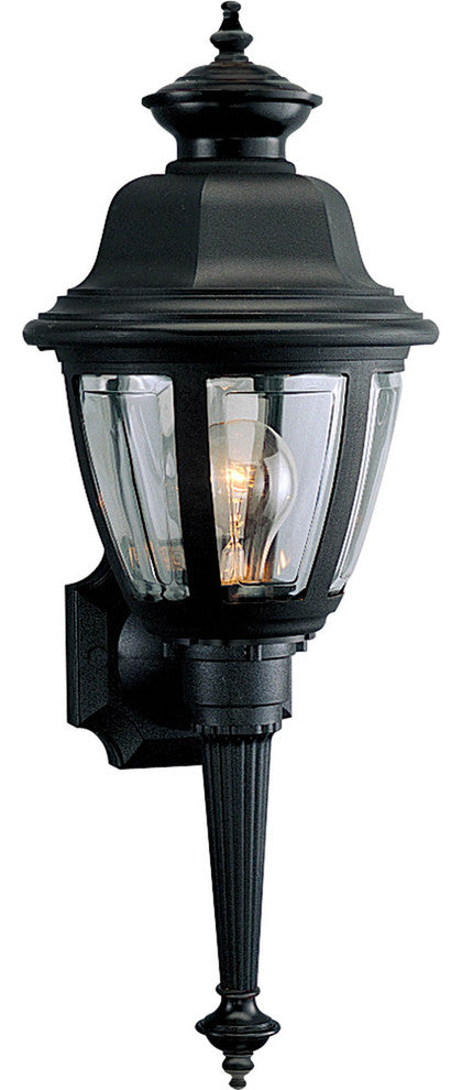 Wall torch with clear beveled acrylic panels.Finish: BlackBulb Type: Uses Medium BaseBulb Wattage: 60Bulb Quantity: 1Listed: Wet location listedMount Type: WallStyle: Traditional/ClassicRoom Type: Outdoor Lighting and/orDimensions: Width/Diameter:8"Height:21"MOUNTING: Wall mountedMounting strap for outlet box included4-1/2, 4-3/4ht.ELECTRICAL:Pre-wired6" of wire supplied120VLAMPING:Quantity: 160W Medium BaseMedium phenolic socketADDITIONAL INFORMATION:UL-CUL Wet location listed1 year warrantyCompanion fixtures are available