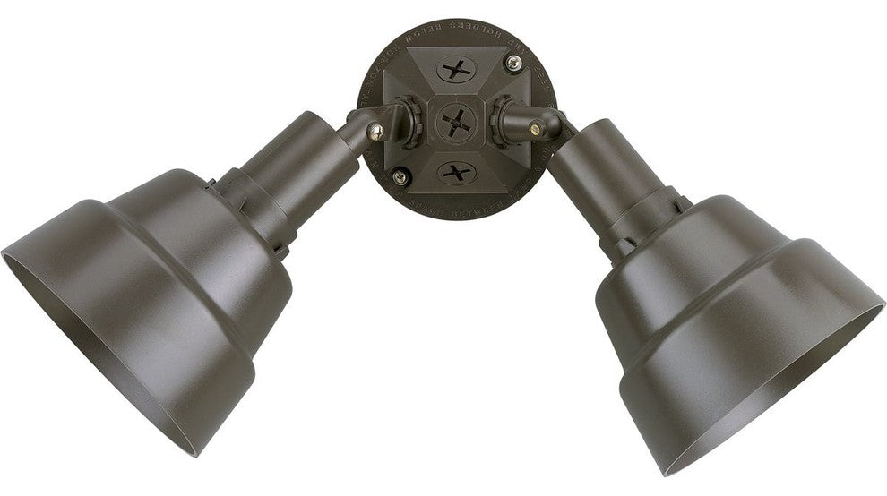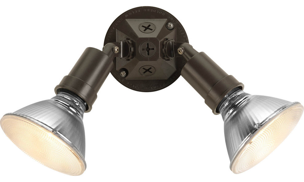 Double non-metallic PAR lampholder in Bronze finish.Finish: Antique BronzeBulb Type: Uses PAR-38Bulb Wattage: 120Bulb Quantity: 2Listed: Wet location listedMount Type: WallStyle: Utilitarian/CommodityRoom Type: Outdoor Lighting and/orDimensions: Width/Diameter:11"Height:4-5/8"MOUNTING:Wall mountedBack plate4-5/8 dia.ELECTRICAL:Pre-wired6 of wire supplied120VLAMPING:Quantity: 2120W PAR-38Medium porcelain socketsADDITIONAL INFORMATION:cCSAus Wet location listed1 year warrantyCompanion fixtures are available