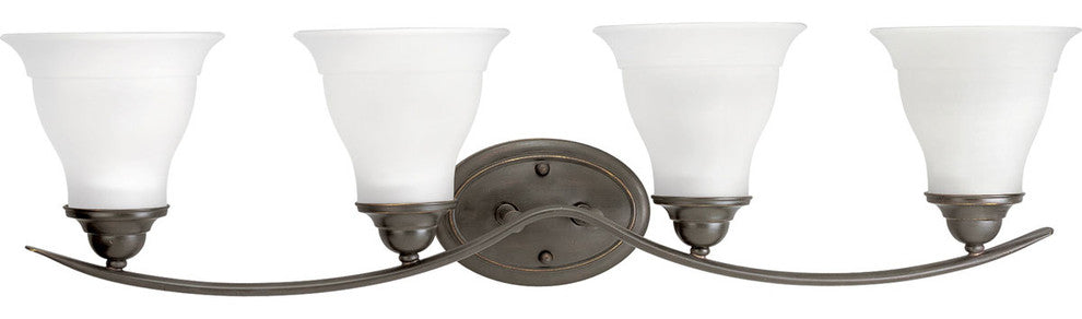 Four-light bath fixture featuring soft angles, curving lines and etched glass shades that mount up or down. Width: 33.25. Height: 8.25. Depth/Extension: 7.375. Bulbs Included? No. Number of bulbs: 4. Bulb Type: A19 Medium Base. Wattage: 100W. Install Position: Wall - Up/Down facing. Collection: Trinity. UL Listing: UL-CUL - Damp location listed Matches Traditional decor. Glass Color: Etched. Dark Sky Compliant: No. More Info: Fixture can be installed facing upwards or downwards; Listed for damp locations. HCTR: 5-7/8". Wire Length: 6". Finish Type: Painted. Glass Shape: Shades. 1 year warranty. Room Suggestion: Bathroom Lightin
