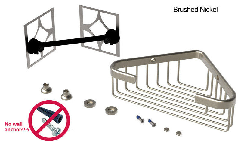 Promessa Deep Corner Soap Basket Brushed NickelDimensions 7 3/4" length x 4 7/8" width x 2 1/4" depthSolid brass basket, brazed constructionPermaTile Installation Kit Include:•  Includes (1) ready to install, stainless steel, PermaTile fastener•  Includes (2) solid brass standard ferrules for tile thicknesses over 1/4"•  Includes (2) solid brass thin-wall ferrules for tile thicknesses under 1/4 "•  Includes (2) 8-32, stainless steel, phillips-head screws•  Includes (2) decorative plugs Traditional hardware installation requires drilling, compromising tile installations. Now, with the PermaTile System, tile mechanics have a clear advantage: a simple installation system that adds value to the tile professionalPermaTile Fasteners The first non-penetrating, non-intrusive tile fastening system This high quality, stainless steel fastening component will attach with unprecedented strength to wall surfaces with latex modified mortar. This system provides a solution that is simple and measurably strong. PermaTile Systems will end unnecessary damages resulting from drilling finished tile work.•  Will not violate waterproofing, plumbing or wiring no more drilling•  Mortar-based fastening system•  Non-corrosive stainless steel fastener•  Over 10X the strength of standard fastener•  Tested by TCNA (Tile Council of North America) Designed specifically for tile applications by tile installers•  Will work with all standard tile products and thicknesses•  Designed specifically for tile professionals•  Encourages quick turnaround where shelving is required•  Eliminates failures resulting from drilling into completed tile work - such as puncturing •  waterproofing, tile breakage, plumbing and wiring intrusions•  Eliminates the need for wood blocking behind the wall•  Installation can occur within the body of a tile or a grout joint•  Basket mounting can occur immediately after grouting - no special trips•  Learn how to install in minutes•  No special tools required