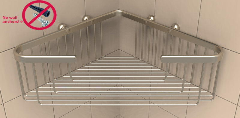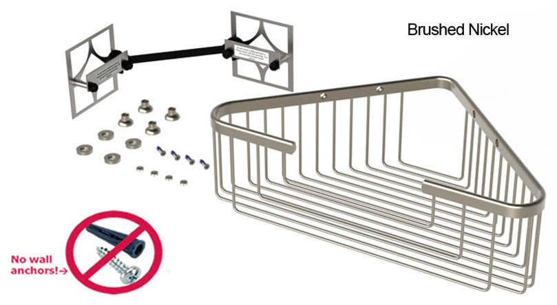 Promessa Extra Deep Corner Soap Basket Brushed NickelDimensions 13 3/4" length x 8" width x 4" depthSolid brass basket, brazed constructionPermaTile Installation Kit Include:•  Includes (1) ready to install, stainless steel, PermaTile fastener•  Includes (2) solid brass standard ferrules for tile thicknesses over 1/4"•  Includes (2) solid brass thin-wall ferrules for tile thicknesses under 1/4 "•  Includes (2) 8-32, stainless steel, phillips-head screws•  Includes (2) decorative plugs One of the largest corner baskets ever produced, simply because of our unique mortar based, PermaTile Fastening System. Baskets of this size and quality are rare because of the limitations associated with traditional penetrating wall anchoring systems. Our extra Deep Corner is a toiletries workhorse that marries beauty with functionality. Designed to help organization all your body care products, even those purchase in large containers. Promessa Series Baskets offer a complete shelving solution for tiled showers. Not only extraordinary strong, this system was designed exclusively for tile professionals. Constructed from solid brass our premium finishes come with a 5 year warranty. TileWare''s eclectic baskets will fit a broad style palette and will work with any tile motif and pattern. By combining style, function and an inventive fastener technology these products will provide a lifetime of style and service.