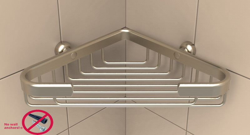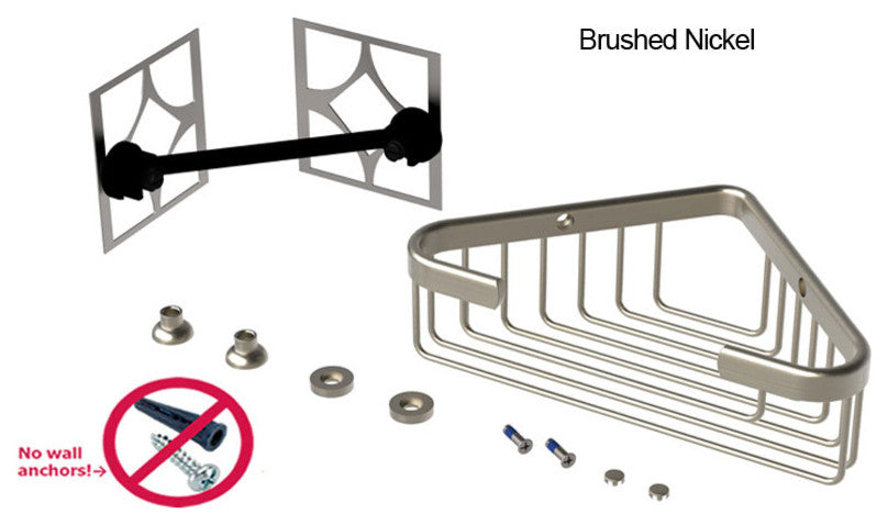 Promessa Shallow Corner Soap Basket Brushed NickelDimensions 7 3/4" length x 4 7/8" width x 1 3/8" depthSolid brass basket, brazed constructionPermaTile Installation Kit Include:•  Includes (1) ready to install, stainless steel, PermaTile fastener•  Includes (2) solid brass standard ferrules for tile thicknesses over 1/4"•  Includes (2) solid brass thin-wall ferrules for tile thicknesses under 1/4 "•  Includes (2) 8-32, stainless steel, phillips-head screws•  Includes (2) decorative plugs Traditional hardware installation requires drilling, compromising tile installations. Now, with the PermaTile System, tile mechanics have a clear advantage: a simple installation system that adds value to the tile professionalPermaTile Fasteners The first non-penetrating, non-intrusive tile fastening system This high quality, stainless steel fastening component will attach with unprecedented strength to wall surfaces with latex modified mortar. This system provides a solution that is simple and measurably strong. PermaTile Systems will end unnecessary damages resulting from drilling finished tile work.•  Will not violate waterproofing, plumbing or wiring no more drilling•  Mortar-based fastening system•  Non-corrosive stainless steel fastener•  Over 10X the strength of standard fastener•  Tested by TCNA (Tile Council of North America) Designed specifically for tile applications by tile installers•  Will work with all standard tile products and thicknesses•  Designed specifically for tile professionals•  Encourages quick turnaround where shelving is required•  Eliminates failures resulting from drilling into completed tile work - such as puncturing •  waterproofing, tile breakage, plumbing and wiring intrusions•  Eliminates the need for wood blocking behind the wall•  Installation can occur within the body of a tile or a grout joint•  Basket mounting can occur immediately after grouting - no special trips•  Learn how to install in minutes•  No special tools required