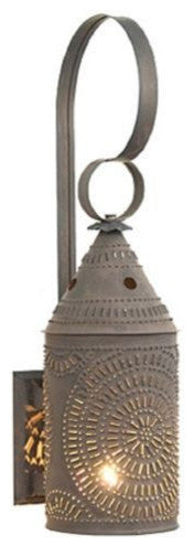 Primitive rustic country - punched tin wall sconce - vintage colonial lantern in blackened tin finish - this reproduction of the classic colonial lantern will most certainly become a worthy addition to whichever room you decide to grace with its simple yet stylish elegance! - the classic hanging lantern is handcrafted by a generational tinsmith and highlights the punched chisel pattern with a distressed, blackened tin finish! - versatile enough to bring colonial warmth and charm to almost any room in your home! - all of our punched tin, wrought iron and country lighting offerings are individually handcrafted with old world craftsmanship, quality and style. - wired with one standard socket, 60 watts max. (60w) blackened tin finish. - bulbs are not included - handcrafted in pennsylvania. - ul listed - measures: 22"h (lantern base-top of hanger) x 8"w - made in the usa