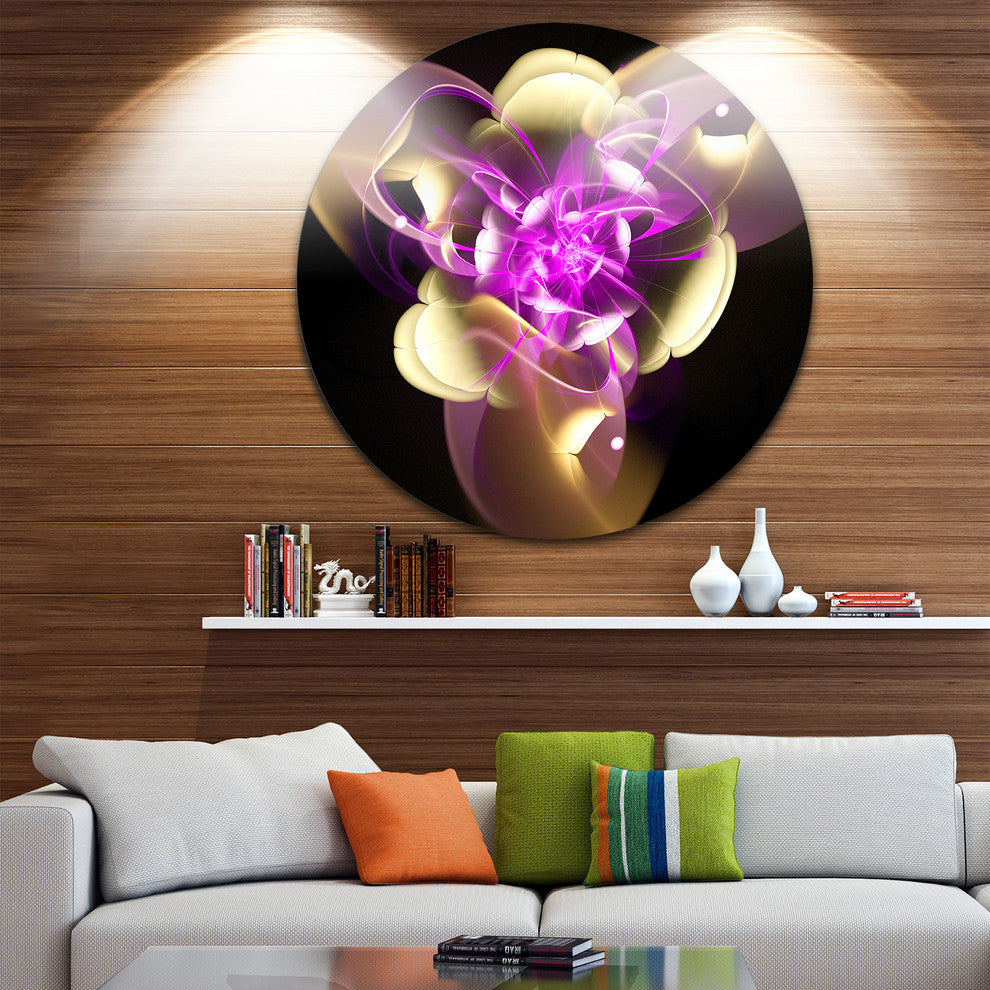 Bring Contemporary Abstraction to your home with this large Circle Metal wall art. This Purple and Golden Fractal Flower Design Metal Artwork makes it the focal point of any room or office.