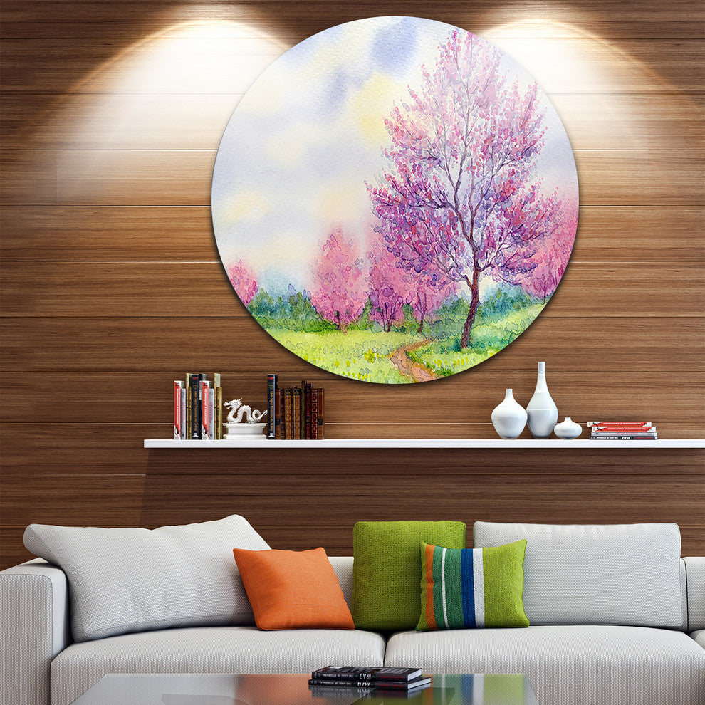 Bring Contemporary Abstraction to your home with this large Circle Metal wall art. This Purple Spring Landscape Metal Artwork makes it the focal point of any room or office.