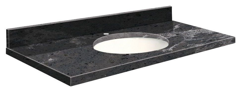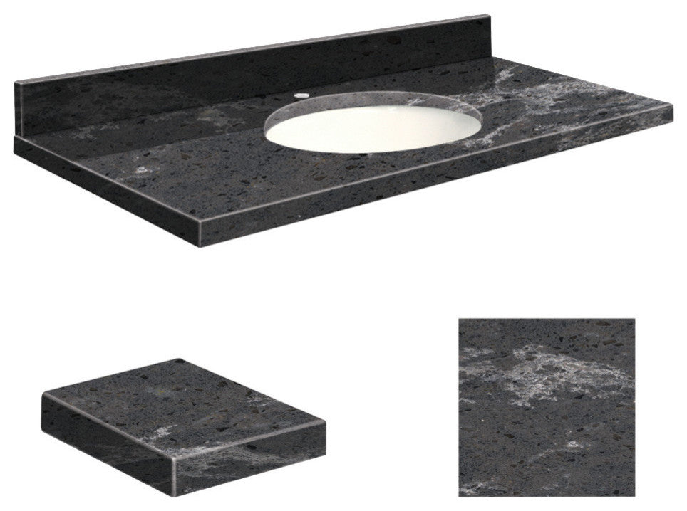 Transolid engineered quartz is produced from 93% quartz under extreme high pressures to yield a top that is hard, stain and heat resistant with a consistent color throughout. Transolid quartz tops never need sealing, polishing or reconditioning and are practically care-free. They are exceptionally hard, making them resistant to cracks, chips, scratches and stains for years of trouble-free beauty. All include an undermount oval china bowl and 4-in loose backsplash.