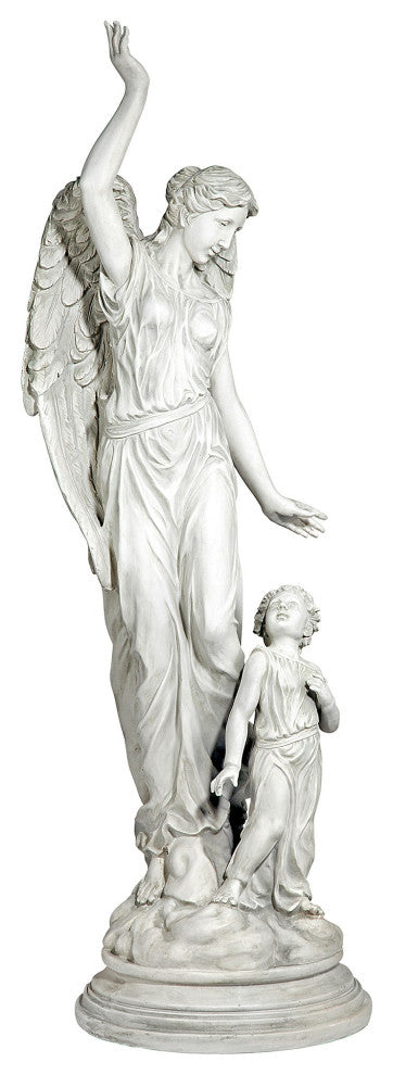 Feel the peace. Inspired by the 1890 Italian original angle sculpture, with a wonderful serpentine design that guides the eye along every angelic detail of this majestic sculptural figure, God''s messenger gestures with love and lowered feathered wings that she is the favored guardian of children. At four feet tall, our Design Toscano exclusive celestial being is cast in quality designer resin with a beautiful antique stone finish. 14.5"Wx14.5"Dx48.5"H. 29 lbs.