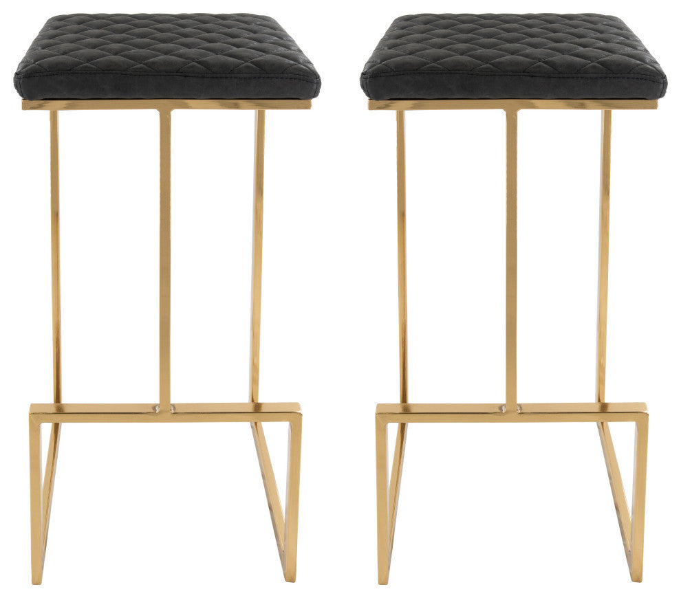 Quincy Leather Barstools, Square Seats and Gold Metal Frame, Set of 2, Charcoal Black