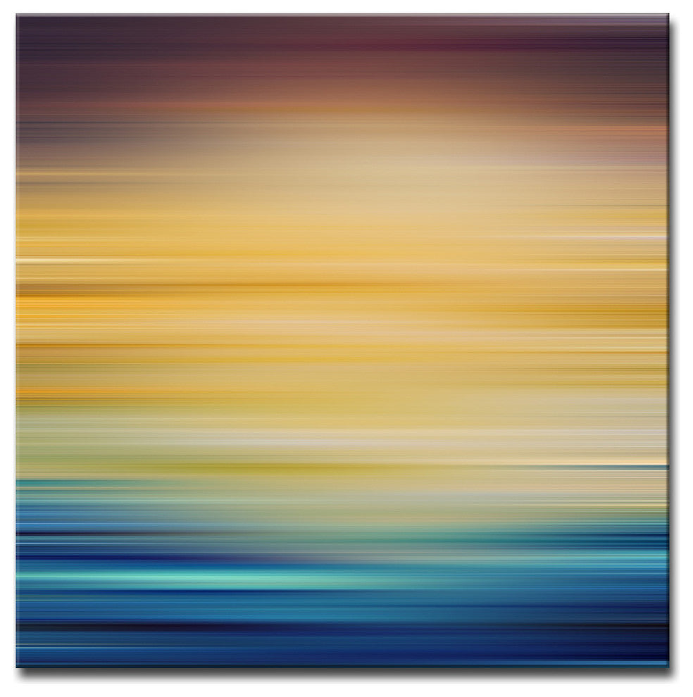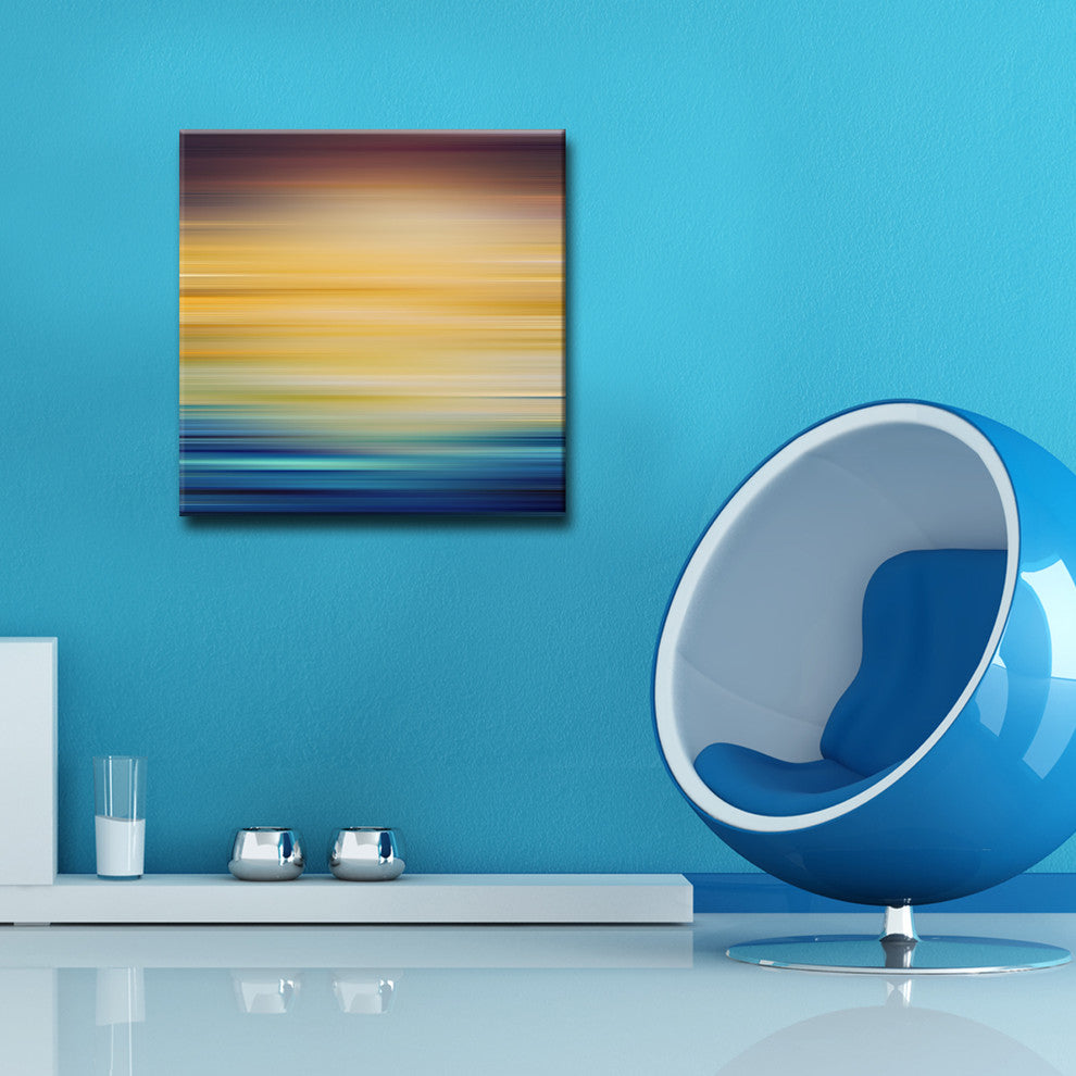 A mod, cosmic horizon or interstellar landscape is characteristic of Ready2HangArts latest collection Blur Stripes. These celestial works compose an austere series featuring a color palette compatible with most every home decor style and taste. ''Blur Stripes V'' is an abstruse horizon, inspired by a coastal sunset; a golden sun insignia encompasses the layers of oceanic blues below, and the spectrally vivid gradient above. Nurture the cohesive design within your space through a tailored, Blur Stripes canvas art piece; experience your interior design dreams borne.