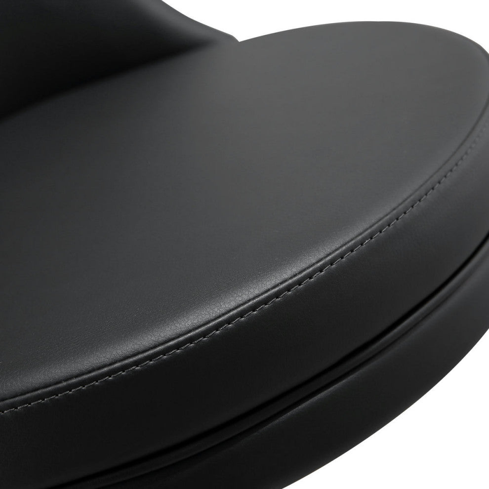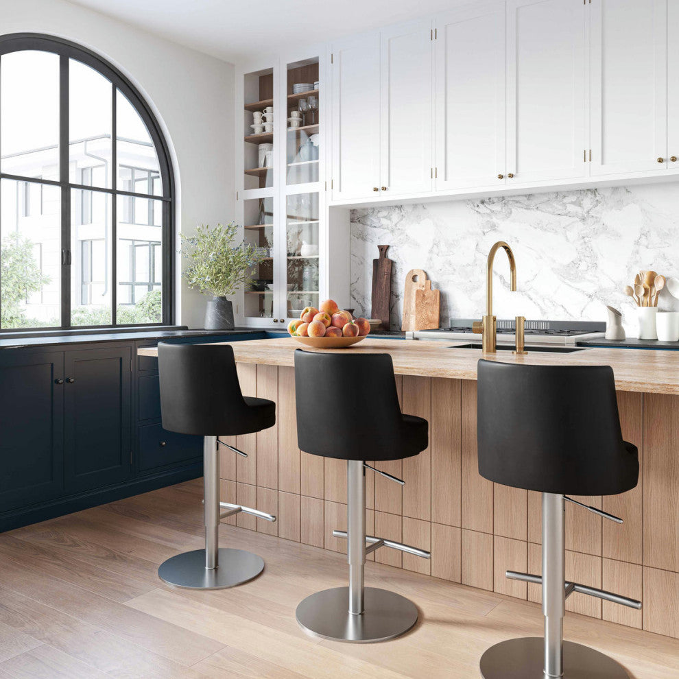 The Reagan stool is the sleek and modern piece that your home bar or kitchen space needs. The solid stainless steel frame provides a sturdy base, while the plush seat and footrest ensure maximum comfort. Its subtle curves and stylish simplicity will undoubtedly bring enjoyment and comfort to your home. Available in black, white, and sea foam green.Handmade by skilled furniture craftsmenStainless steel frame and footrestAdjustable seat height with gas liftComfortable Vegan Leather upholstered back and seatAvailable in black, white, or seafoam greenLeg Color : SilverLeg Material : Stainless Steel 201Seat Width : 18.5Seat Depth : 16Seat Height : 32.4Seat Construction : MDF FrameFill Material : FoamSoft Close Drawers/Doors : NoAdjustable Shelves (Y/N) : NoProduct Color : BlackProduct Materials : MDF,Stainless Steel,Vegan LeatherProduct Dimensions : 18.5"W x 19.8"D x 41.7"HProduct Weight : 37.2LBs
