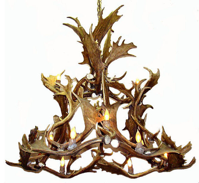 Real Antler Custom Fallow Chandelier (47-50"D x 32-34"H), 16 Light Sockets, 6 feet of rustic bronze chain. Handmade in North America using top quality naturally shed real antlers. Sockets are made to resemble real antler, each socket rated up to 60 Watts. Comes balanced and ready to hang. Frosted Bent Tip Candelabra Bulbs included. Certified in U.S & Canada (CSA listed to comply with UL 1598).