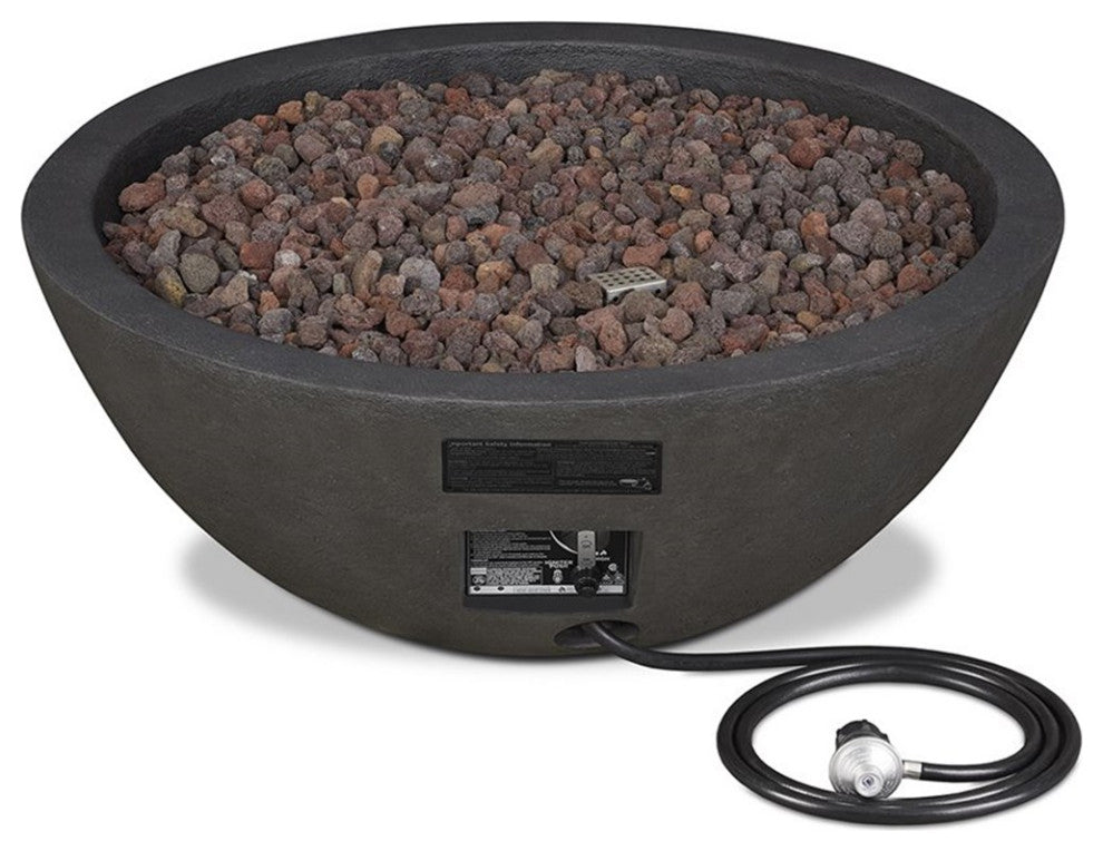 Transform your backyard into an extraordinary entertainment space with the Riverside Gas Fire Bowl. This natural looking fiber-cast concrete bowl is lightweight yet durable, and includes lava rock, tank seat and a protective cover. Conceal your standard 20 lb. propane tank with the matching tank cover, (sold separately) or convert to a Natural Gas fire bowl with the included conversion kit.Features: • Finish: Shale • Material: Fiber cast concrete • CSA Certified • 50,000 BTU burner • Electronic Ignition • Easily converts to Natural Gas with the included NG conversion kit and the help of a certified gas technician • External gas line is required for connection to natural gas source. • Includes: Fire bowl, 8'' LP hose and regulator, lava rock filler, tank seat, • Includes: electronic ignition, Natural Gas conversion kit and protective cover. • Burns for 9 hours (high setting) or 26 hours (low setting) • 1 year limited warranty • Accessorize with Riverside propane tank cover, Real Flame fire glass, and Real Flame rubber hose coverSpecifications: • Product Dimensions: 13" H x 36.35" W x 36.35" D • Product Weight: 98.3lbs