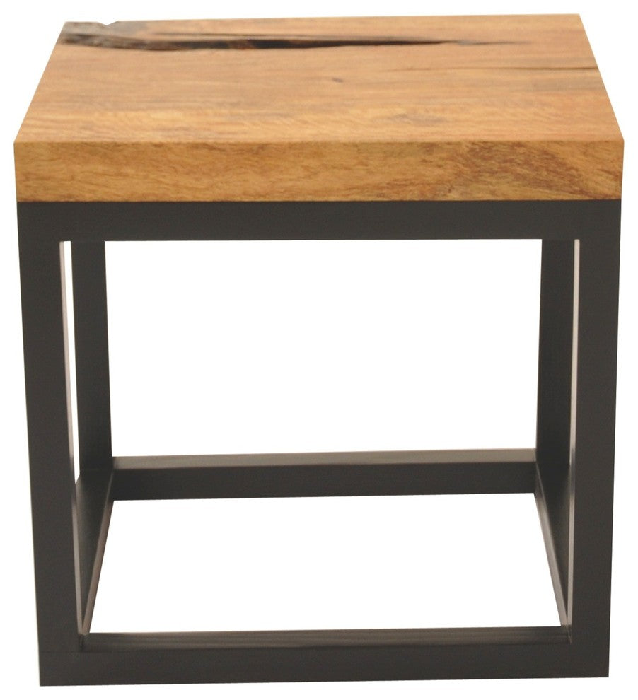 Contemporary side table made of solid reclaimed mango wood and base made of stained oak.