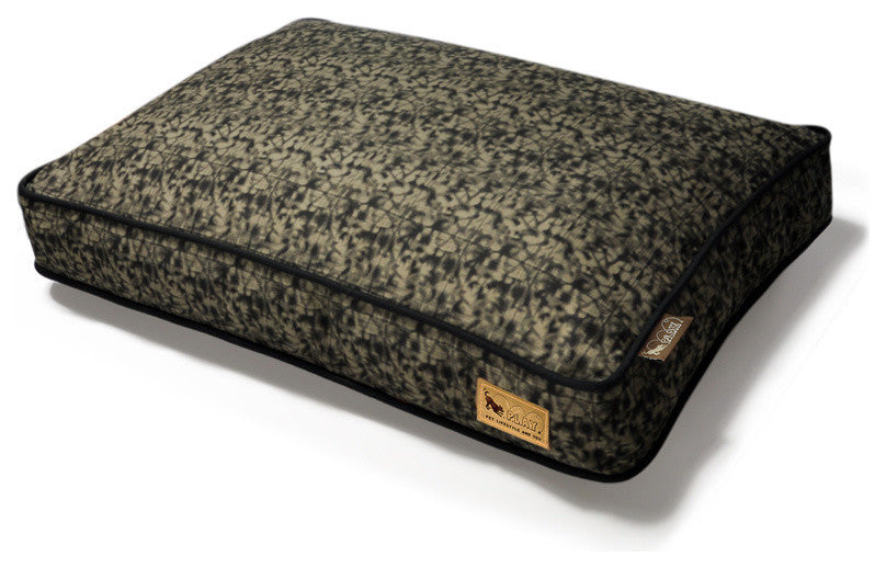Rectangular pet bed (Small) Frolic design from the Original Collection (Olive); 100% natural cotton cover; 100% machine washable; eco-friendly and durable construction.
