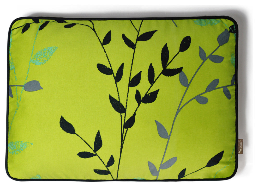 Rectangular pet bed (Small) Greenery design from the Original Collection (Pear/Rifle Green); 100% natural cotton cover; 100% machine washable; eco-friendly and durable construction Care instructions: Cover and insert may be removed. Machine wash cold and gentle low heat cycle.