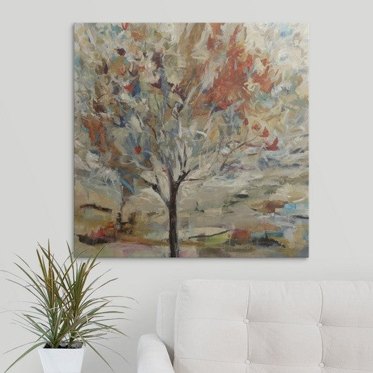 Gallery-wrapped canvas entitled, "Red Bird Tree".Contemporary painting of a single tree with vibrant leaves and branches, on a background filled with multicolored patches of thin and thick brushstrokes.Our wrapped canvases feature a proprietary design that prevents warping or sagging over time. By using archival inks and artist-grade canvas, our premium canvases are sure to add that extra touch to any space. Lastly, our canvases are finished with a closed back that incorporates pre-installed hanging hardware for easy installation.
