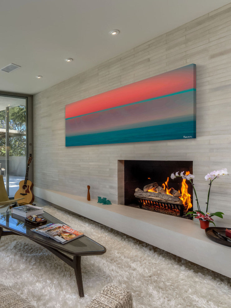 Striking and unique, the "Red Glow" Print on Canvas by Parvez Taj will bring your walls to life. Printed on canvas, this 45 inch wide by 15 inch tall contemporary artwork will make a statement in any living room, dining room, or bedroom.- Fine art canvas print by Parvez Taj- Professionally hand stretched- Gallery wrapped in sustainable, non-warping wood- Arrives ready to hang- Made in the USA- Includes a certificate of authenticity- Artist signature on the front