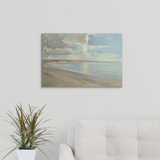Gallery-wrapped canvas entitled, "Reflected Clouds, Oxwich Beach, 2001".A contemporary, realistic landscape painting of a sandy beach on a partially cloud day.Our wrapped canvases feature a proprietary design that prevents warping or sagging over time. By using archival inks and artist-grade canvas, our premium canvases are sure to add that extra touch to any space. Lastly, our canvases are finished with a closed back that incorporates pre-installed hanging hardware for easy installation.