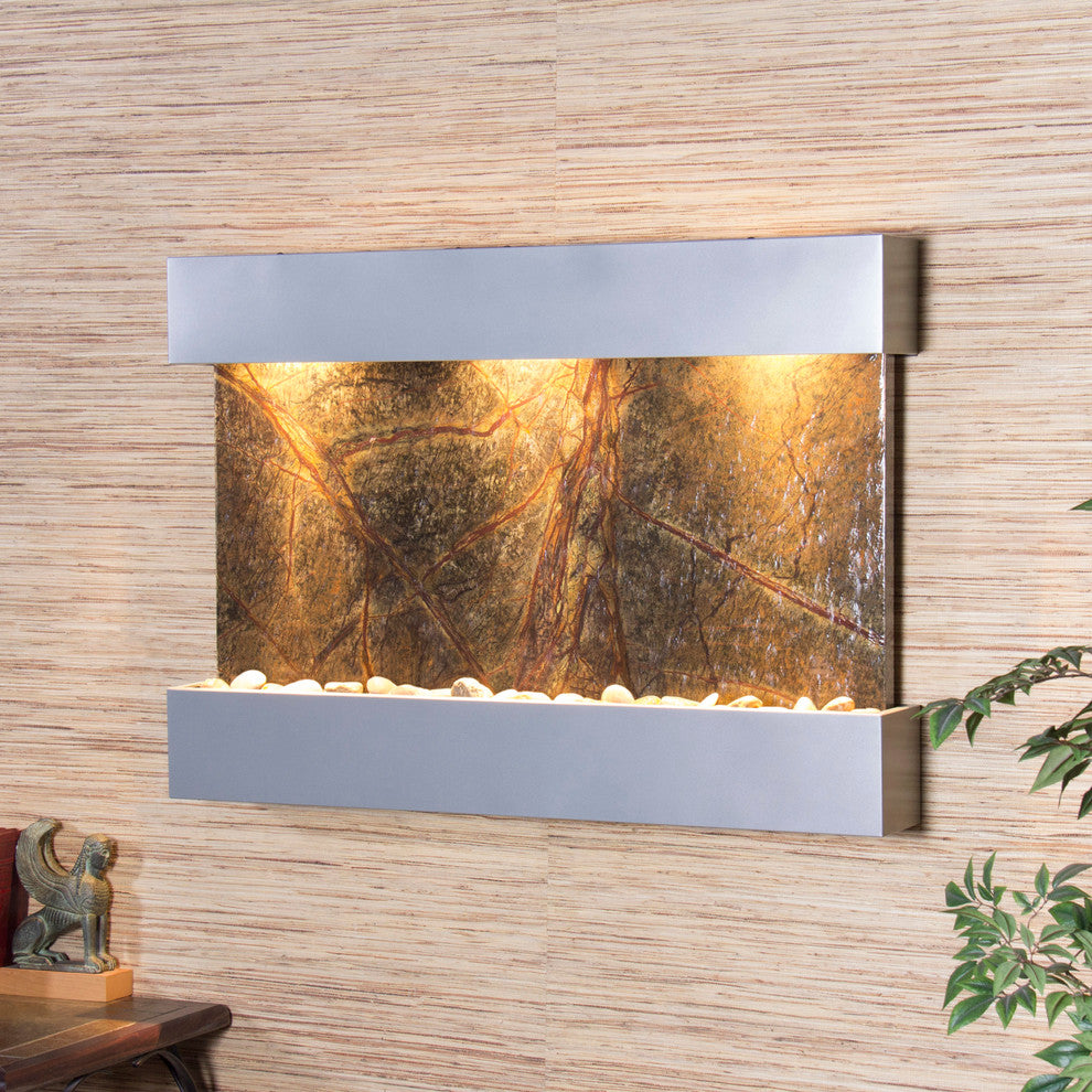 The Reflection Creek indoor wall water fountain will bring the calming sounds of running water to your home. After a long day at work, imagine coming home to the peace and tranquility of a water feature. The Reflection Creek is perfect above a table, a sofa, or large potted plants. This horizontal water feature is available in several metal trim finishes and water surface options so you can find the perfect look for your area. Start relaxing today with the soothing sounds of running water in your home.
