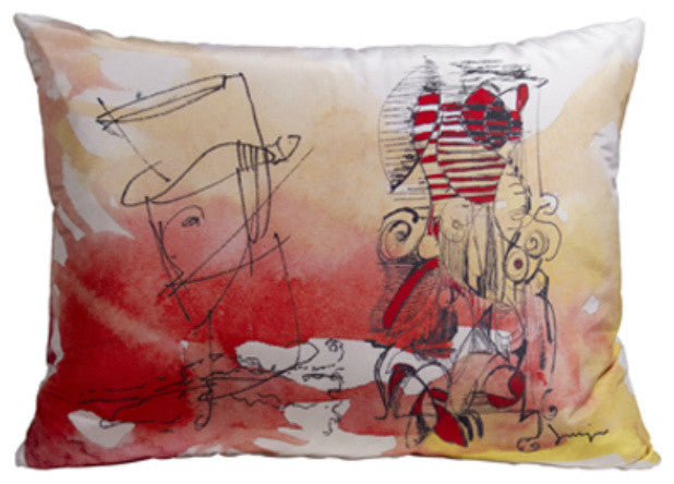 Based on Joe Ginsberg"™s private gallery, the fine art designer pillow collection is a signature anthology. A spirited compilation of the artist"™s unique sketches and vividly hued watercolors provides a wealth of decorative options. Produced on raw silk taffeta with a velvet backing. Fill: 75% goose down; 25% feather. Handmade by Joe Ginsberg in New York.
