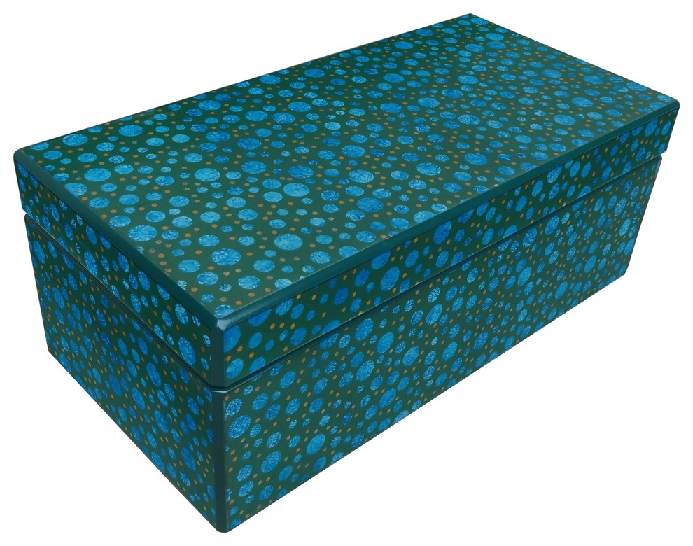Extra large and luxurious two tiered box. Use as a holder for jewelry or remove the inserts for a fantastic catch all in your living room or entry. A very special reverse painted mirror piece. 16"x8"x5.9" Blue and green dots design -- terrific for baubles.Arcadia Home heirloom mirror designs are created using the technique of reverse painted glass, which has been practiced in Peru since the 16th century. The quality of craftsmanship on display in these fair trade glass pieces is a testament to the artisan''s mastery of this time-consuming and difficult process, which requires attention to detail, precision, and patience. By purchasing this design, you are joining our efforts to support artisans worldwide. As handmade pieces, each Arcadia Home design is as unique as the artisan who created it. The mirror in reverse-painted glass pieces can be cleaned with typical glass cleaner, and the borders and edges, which are wood, can be cleaned with a wood polish.