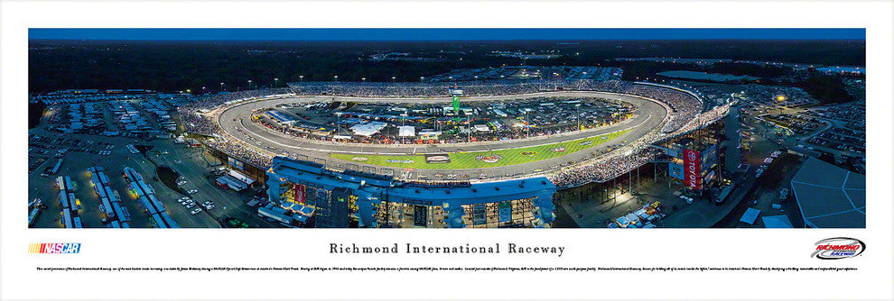 This aerial panorama of Richmond International Raceway, one of the most historic tracks in racing, was taken by James Blakeway during a NASCAR Sprint Cup Series race at America''s Premier Short Track. Racing at RIR began in 1946 and today the unique _-mile facility remains a favorite among NASCAR fans, drivers and media. Located just outside of Richmond, Virginia, RIR is the focal point of a 1,000 acre multi-purpose facility. Richmond International Raceway, known for holding all of its events "under the lights," continues to be America''s Premier Short Track by developing a thrilling, memorable and unparalleled guest experience.