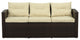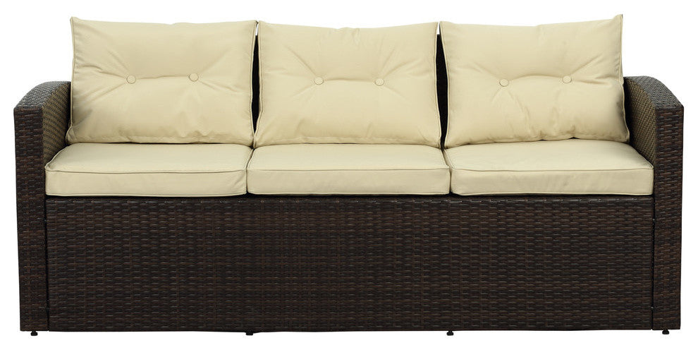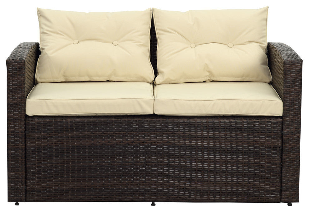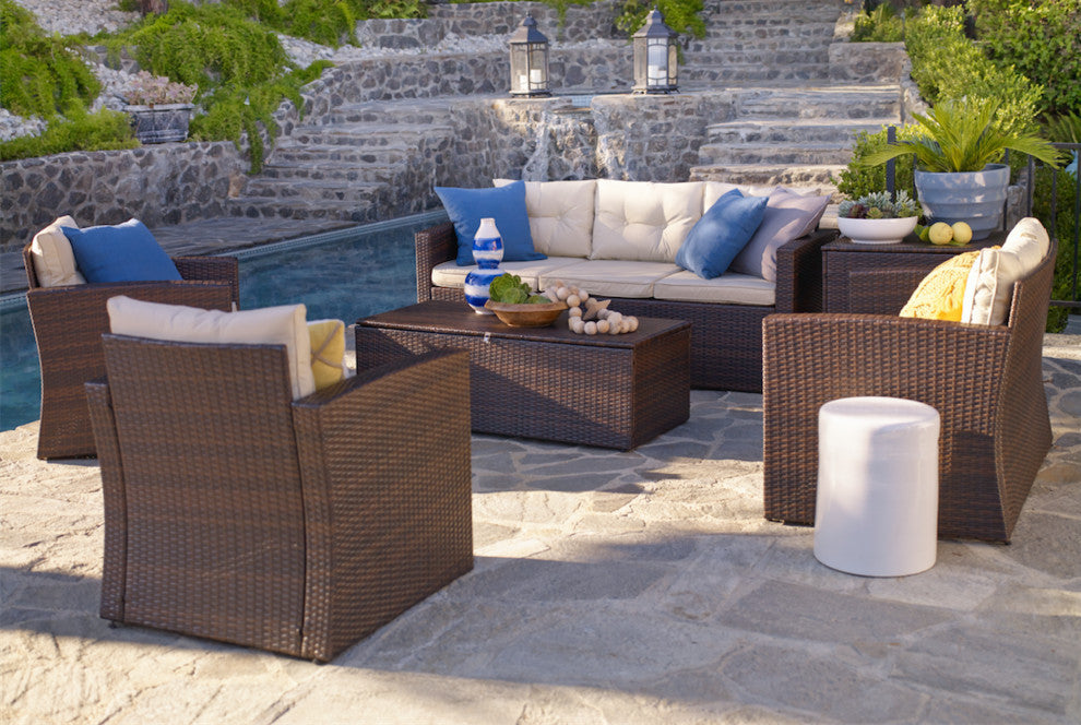 Entertain outdoors with the Rio 6-Piece Wicker Conversation Set. This set is crafted from all-weather wicker that does not fade or sag like conventional wicker, and is topped with waterproof back and seat cushions. The set includes one three-seated sofa, one love seat, two armchairs, one storage unit and one coffee table with storage. Bring comfortable elegance to your home and garden with designs by THY-HOM.Powder-coated steel frameUV-resistant weatherproof wickerWeatherproof polyester cushion coversFoam-filled cushionsEasy to clean (use mild soap and water)Seats up to 7 peopleWashable cushionsSet features corner storage and coffee tableHardware for assembly included1-year limited warrantyWicker finish: Dark brownCushion finish: BeigeSofa dimensions: 72"� x D 31"� x H 30"�Table dimensions: W 47"� x D 23"� x H 16"�Ottoman dimensions: 28x28x25Ottoman weight capacity (lbs.): 130Chair dimensions (in.): L x W x H-28 x 30 x 30Chair weight capacity (lbs.): 300Love seat dimensions (in.): L x W x H-50 x 31 x 30Love seat weight capacity (lbs.): 600