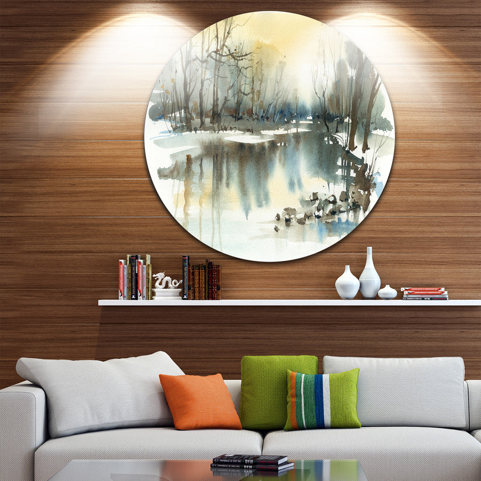 River In Winter, Landscape Painting Round Metal Wall Art, 11"