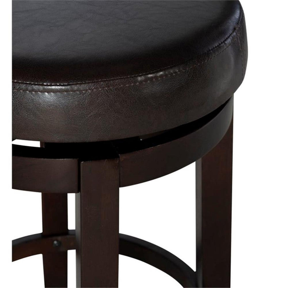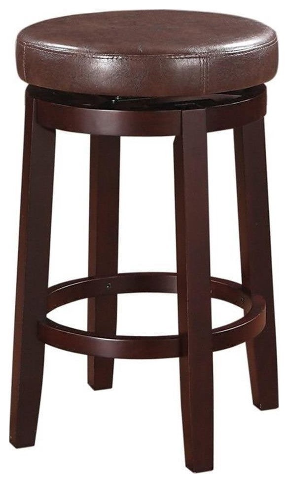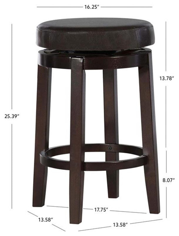 The Riverbay Furniture stool has a transitional design and style that will appeal to any decor scheme. The slightly splayed legs have a straight lined look that lends themselves nicely to the round upholstered top. The swivel ability adds comfort and ease to the piece. Faux leather upholstered, the Riverbay Furniture is a versatile addition to a table, bar or counter.Features: • Material: Crafted from wood, foam and faux leather (83% polyurethane, 17% polyester) • Finish: Brown • Wipe clean faux leather • Plush padding • Swivel seat • Sturdy and durable construction • Counter heightSpecifications: • Product Dimensions: 25.39"H x 17.75"W x 17.75"D • Product Weight: 14.33 lbs • Assembly Required: Some Assembly Required • Seat Height: 25.39" • Seat Dimensions: 16.25" x 16.25" x 2.76" • Weight Capacity: 250 lbs