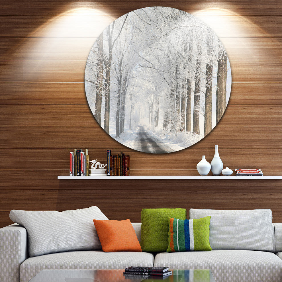 Bring Contemporary Abstraction to your home with this large Circle Metal wall art. This Road Through Frosted Forest Metal Artwork makes it the focal point of any room or office.