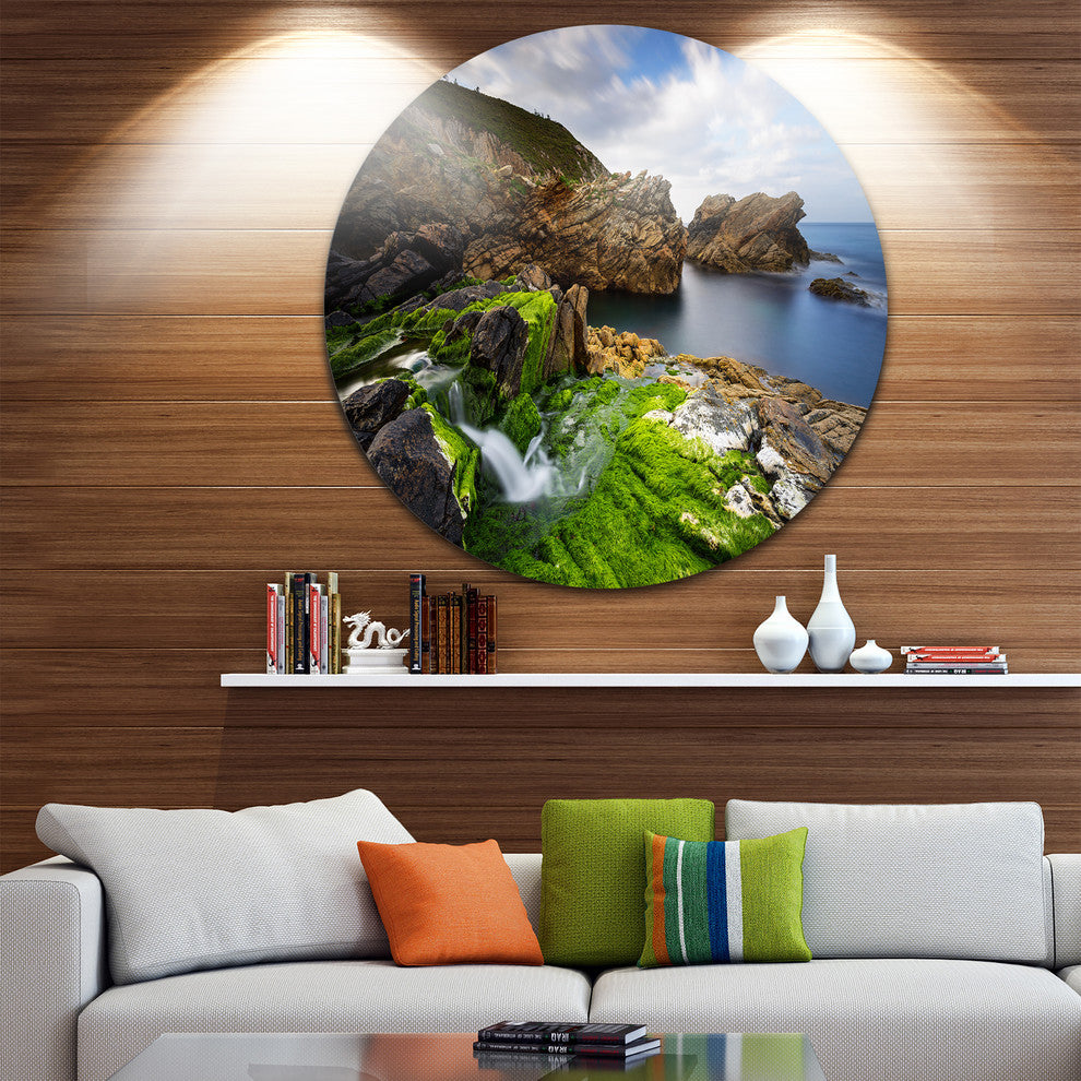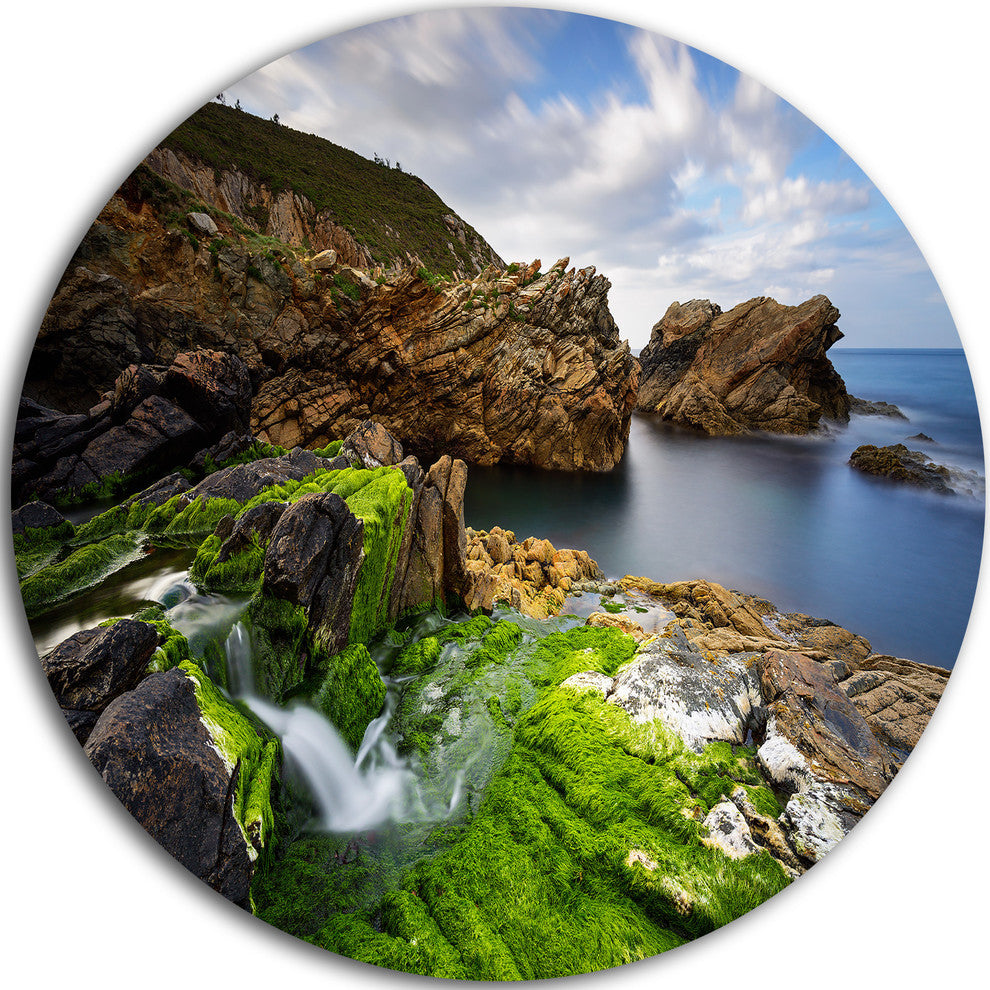 Bring Contemporary Abstraction to your home with this large Circle Metal wall art. This Rocks and Waterfall in Spanish Coast Metal Artwork makes it the focal point of any room or office.