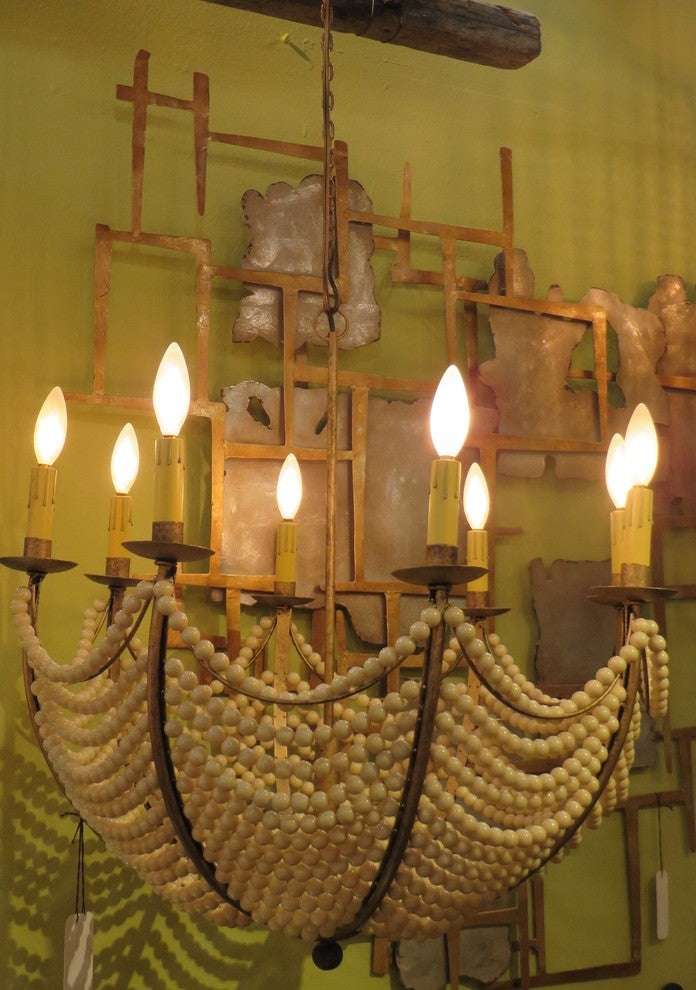 Lavishly elegant, our beaded wall sconces and chandeliers are the perfect way to add romantic lighting to a room. Embellished with strands of resin cream beads. Iron frame has antiqued brown gold finish. Uses eight max 40 watt bulbs (not included), UL approved, Hard- wiredCoordinates with our other Cream Beaded Lighting, available separately. Size: 25'''' H x 26'''' W x 26'''' Deep Weight: 12. 8 lbs. Heirloom Quality - Expertly hand crafted and hand finished Due to the hand crafted nature of this piece, each piece may have subtle differences.