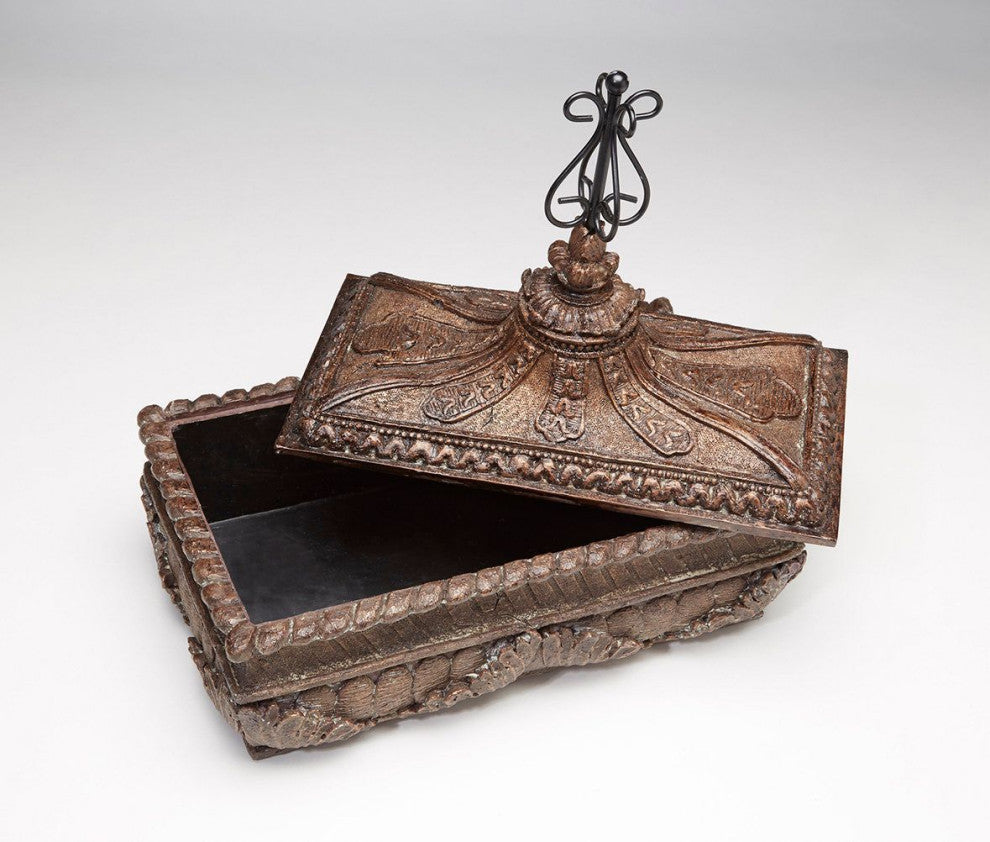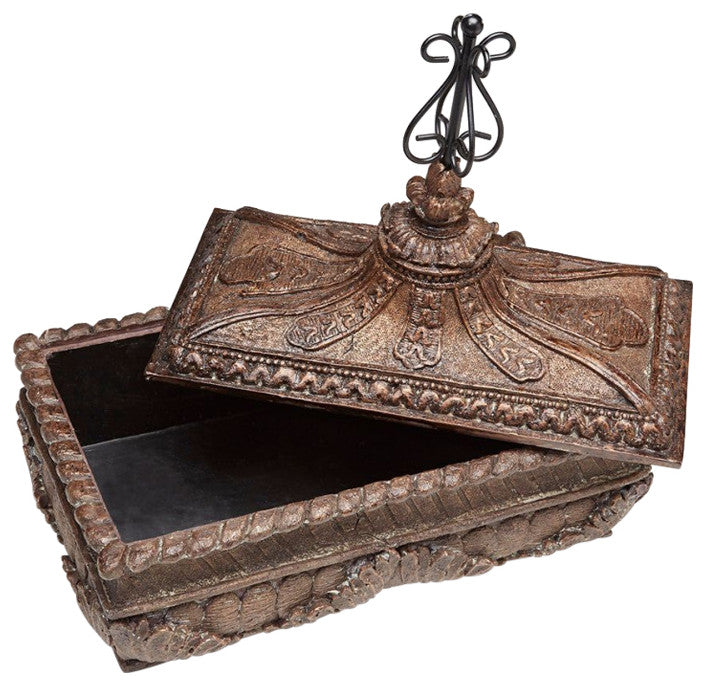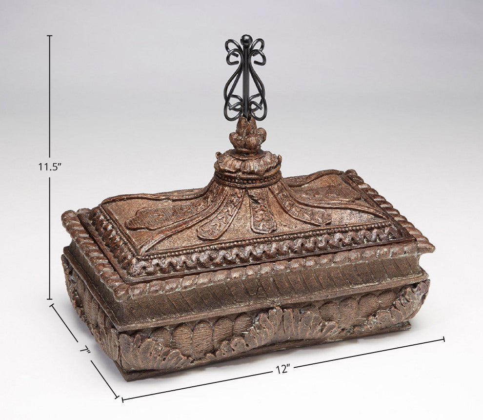 Store your jewelry or other trinkets with the Romine Rectangle Decorative Box. The box brings an antique aesthetic with its regal, intricate details. It displays a rectangular container with a matching lid. Place this atop your vanities or nightstands and it will surely add to the aesthetic of your rooms.Features:Overall product dimensions are 12" W x 7" D x 11.5" HMade from resin finishing to beautify the look of your tabletopsA traditional-style trinket box that can accommodate various trinketsComes with a lid to keep the items out of sightLow-maintenance and easy to cleanDimensions:Decorative Accent PieceAssembled Product: 12 inches wide x 7 inches deep x 11.5 inches high.