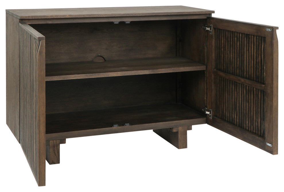 A study in contrast, this cabinet combines modern style with the aged character of reclaimed wood. A durable oak veneer captures the distinctive beauty of reclaimed wood including subtle distressing, hairline cracks, and other historical markings. Sharp, linear design and versatile interior storage make this piece ideal for a variety of spaces.Oak Veneer Two adjustable shelves that offers ultimate flexibility for storage space.Featuring 4 soft closing doors, 180-degree hinges, and magnetic catches for ease of use.Crafted from reclaimed oak veneer, this item features a functional layout and a modern wood slat panel front design. It seamlessly combines style and practicality.Made from sustainably sourced wood, supporting responsible forestry practices and our commitment to maintaining healthy forests.Comes prepacked and delivered right to your front door pre-assembledModernThe handcrafted nature of this wood creates products with character and individuality. The inherent knots, grains, and variations in color and texture, are preserved, to create pieces rich in detail and natural beauty. These unique imperfections and variations are what define our products, with each piece having its own personality.Specifications:Interior Shelf Dimensions: 38.54x15.87x12.64Door dimensions: 20.35x1.18x28.43Clearance from floor to bottom of the frame: 5.50"Dust surfaces with a feather duster and wipe gently with a slightly damp cloth. Be sure to wipe any spills immediately. We recommend the use of coasters and trivets to protect surface from liquids and heat stains. Do not place furniture near heating outlets or direct sunlight. DO NOT USE: Silicone based polishes, cleaners, solvents or abrasives.