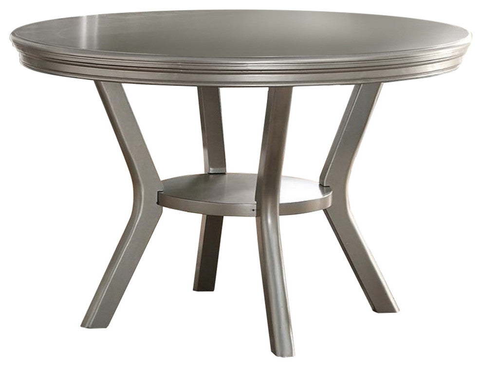 Rubber Wood Round Dining Table With Bottom Shelf SilverCharming And Lavish Style Is Displayed By This Formal Dining Set Trimmed In An Antique Silver Finish. The Dining Table Is Covered In This Magnificent Silver Hue With Detailed Trimmed And Dainty Leg Supports Crafted From Rubber Wood With Birch Veneer. Available In A Round Table With Seating For Up To Four. Dimension: 48" Dia X 30"H (Primary Color: Silver)Includes 1 Dining Table OnlyGreat in style and Highly EfficientSolid construction enhances its durabilityMaterial Used: Rubber Wood MDF w. Birch veneer, Color: SilverBrand: BenzaraCountry Of Origin: China
