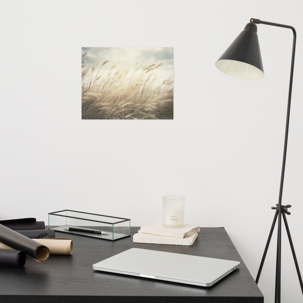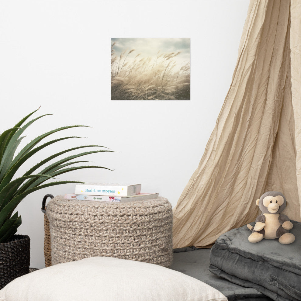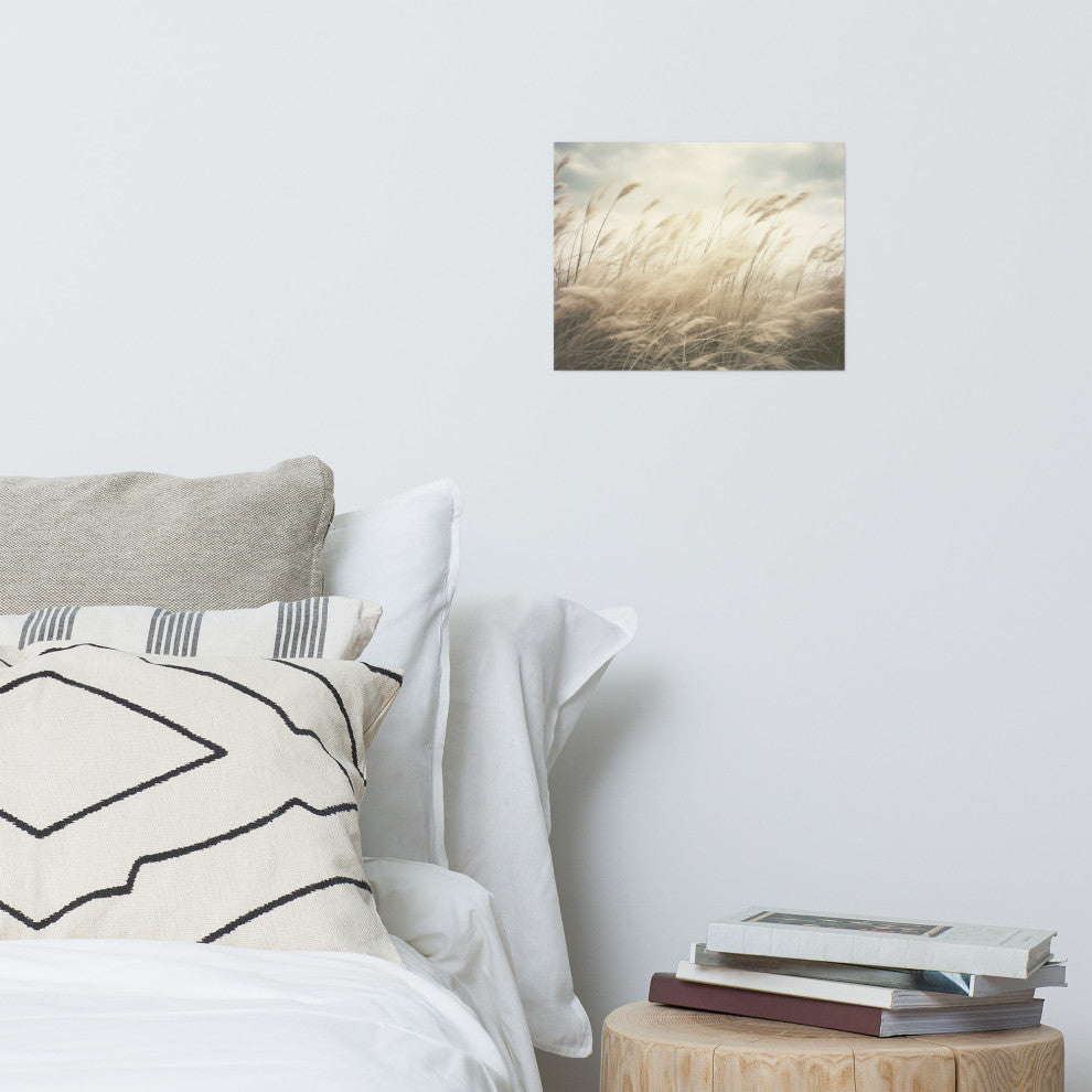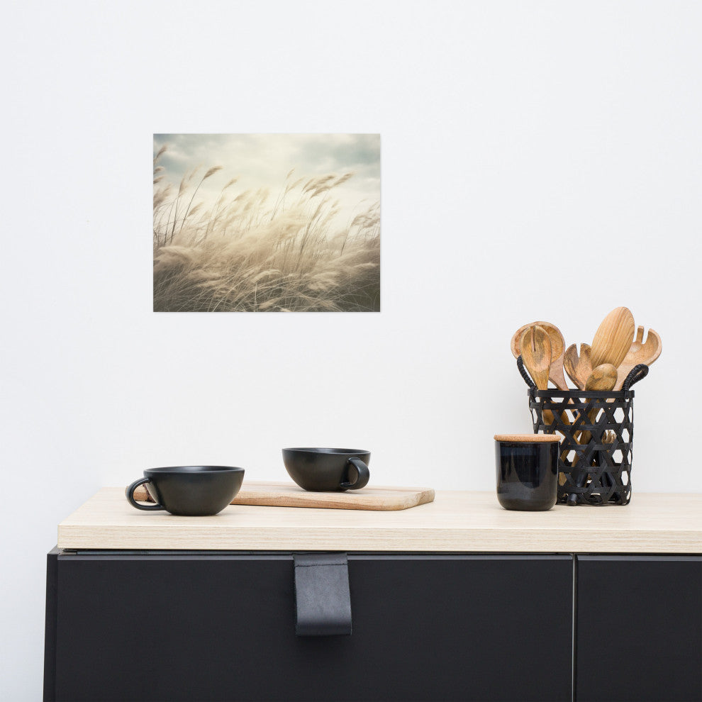 Vintage Beach Artwork: Coastal Serenade Sea Grass Subdued Retro Photorealistic - Digital Art Loose PrintBring the gentle whisper of the coast to your walls with "Coastal Serenade," a serene photorealistic digital artwork. This piece beautifully captures a field of tall, feathery grasses swaying rhythmically in a soft breeze under a muted, overcast sky. The subtle textures and soft, neutral tones evoke a sense of calm and tranquility, reminiscent of a peaceful walk along the dunes.This high-quality loose art print offers you the flexibility to select the perfect frame to complement your personal style and home décor. Whether you envision a light, airy feel with a natural wood frame or a more contemporary look with a sleek, minimalist design, "Coastal Serenade" will add a touch of understated elegance to any room. Hang it in a bedroom for a soothing ambiance, in a living area for a touch of natural beauty, or in an office to create a calming environment.Details:Title: Coastal SerenadeType: Loose Art Print (unframed)Subject: Coastal Grasses, Field, LandscapeStyle: Photorealistic, Digital ArtMood: Peaceful, Tranquil, SerenePerfect for: Bedrooms, living rooms, offices, coastal-inspired décor, anyone seeking a touch of natural calm.Please Note: This is an unframed print. A frame will need to be purchased separately. Please be aware that colors may appear slightly different depending on your screen settings.