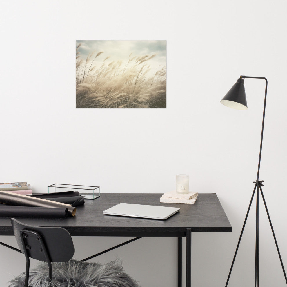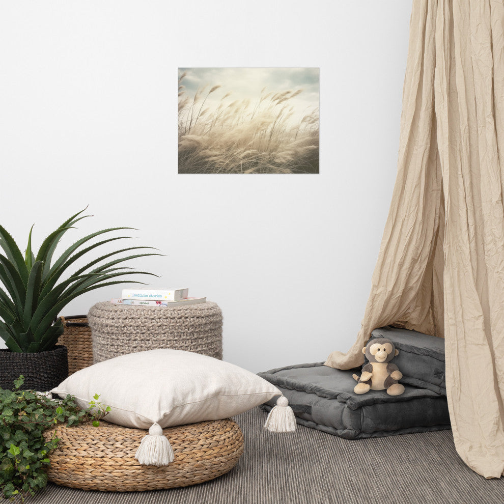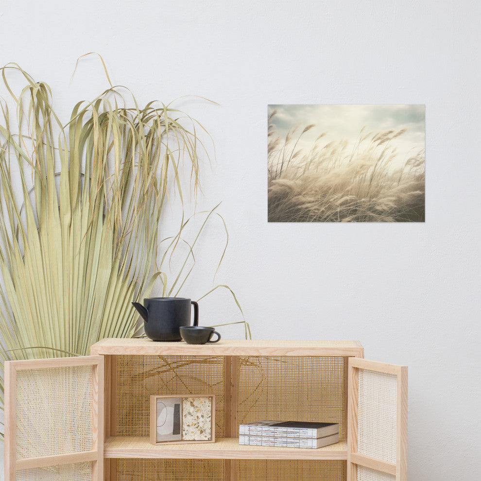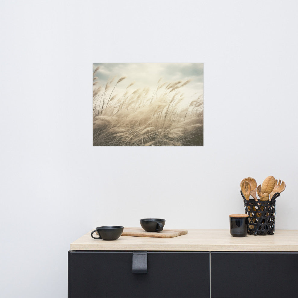 Vintage Beach Artwork: Coastal Serenade Sea Grass Subdued Retro Photorealistic - Digital Art Loose PrintBring the gentle whisper of the coast to your walls with "Coastal Serenade," a serene photorealistic digital artwork. This piece beautifully captures a field of tall, feathery grasses swaying rhythmically in a soft breeze under a muted, overcast sky. The subtle textures and soft, neutral tones evoke a sense of calm and tranquility, reminiscent of a peaceful walk along the dunes.This high-quality loose art print offers you the flexibility to select the perfect frame to complement your personal style and home décor. Whether you envision a light, airy feel with a natural wood frame or a more contemporary look with a sleek, minimalist design, "Coastal Serenade" will add a touch of understated elegance to any room. Hang it in a bedroom for a soothing ambiance, in a living area for a touch of natural beauty, or in an office to create a calming environment.Details:Title: Coastal SerenadeType: Loose Art Print (unframed)Subject: Coastal Grasses, Field, LandscapeStyle: Photorealistic, Digital ArtMood: Peaceful, Tranquil, SerenePerfect for: Bedrooms, living rooms, offices, coastal-inspired décor, anyone seeking a touch of natural calm.Please Note: This is an unframed print. A frame will need to be purchased separately. Please be aware that colors may appear slightly different depending on your screen settings.