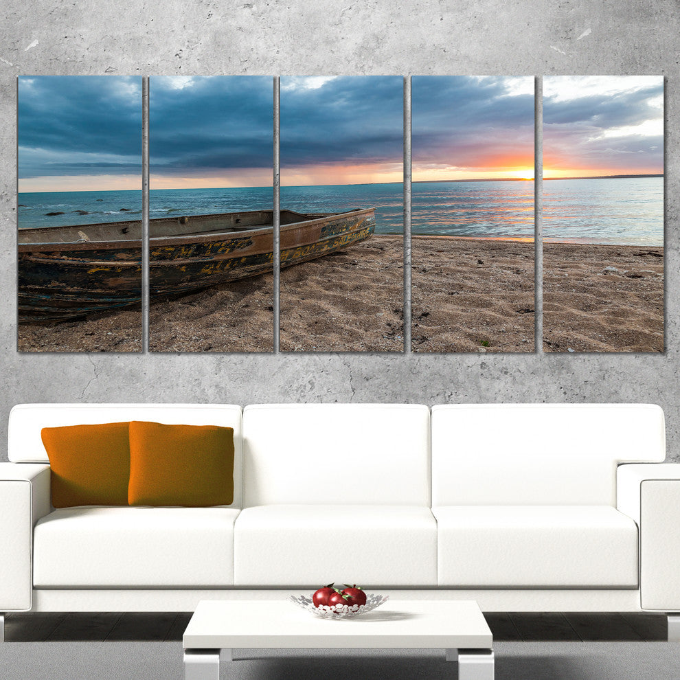 "Rusty Row Boat On Sand At Sunset" Seascape Art Canvas, 5 Panels, 60"x28"