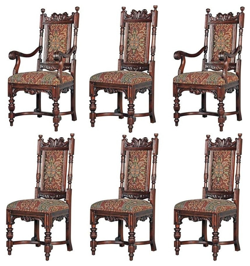 The symphony of hand carving begins with the arched stretcher and baluster legs that rise to showcase detailed skirt and rail before each of these classic Edwardian chairs culminates with enviably ornate urn finials and center pediments. Their detail is amazing! These very symmetrical, heavily masculine side and arm chairs boast a hand-rubbed mahogany finish, cushioned seats upholstered in luxuriously patterned jacquard fabric, and custom hand tacking. Our Toscano exclusives have the look and feel of fine antiques. Side Chair:18??_??___"Wx18??_??___"Dx45"H. 18 lbs. Armchair: 21??_??___"Wx24??_??___"Dx46"H. 22 lbs.