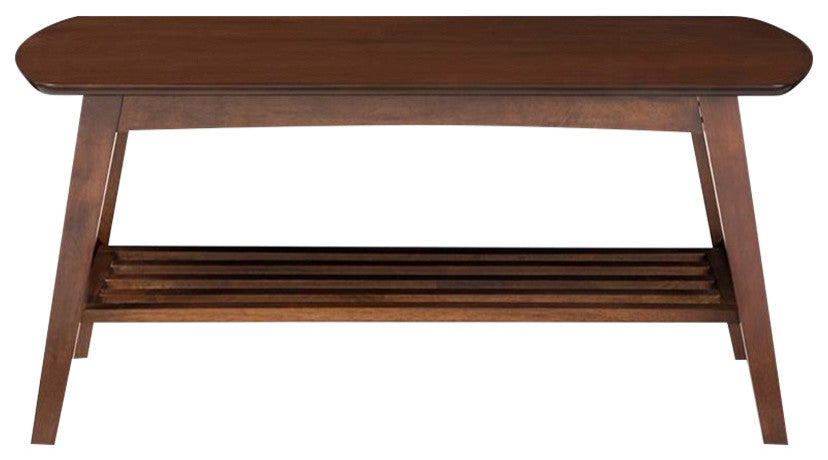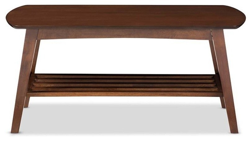 Bold curves, angled legs and dark stained walnut finishing make the Sacramento Coffee Table an eye-catching addition to any home. The slatted open shelf is a striking design feature as well as a roomy compartment for magazines or remote controls. The solid rubberwood and walnut veneer make for a tactile, luxury finish, while clear lacquer brings out the minimalist beauty of a mid-century inspired piece. The Sacramento coffee table doesn''t end here. Get the conversation going around a matching end table and a console table to complete the look. Made in Malaysia, the table requires assembly.