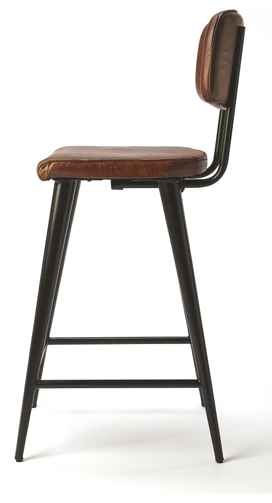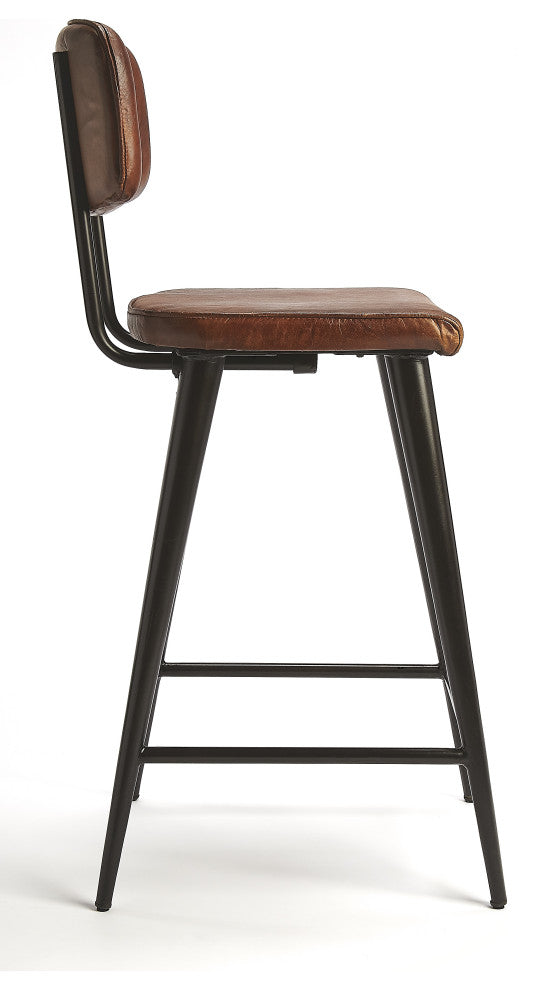 Reminiscent of retro leathers; this counter stool brings a rustic glam to your kitchen. Its supple leather offers comfortable seating and a touch of retro style to your home decor and adds Just the right element to refresh and impress with its metal taper legs. It compliments just about any decor from contemporary to farmhouse. Crafted with a genuine leather seat and solid iron frame Frame has a smooth powder coated finish for durability Features a padded seat back and padded seat along with a foot rest for maximum comfort Quick and easy assembly by sliding the seat back pipes into seat base brackets underneath the seat and tightening with the provided tool Seat dimensions are 15''W x 16.625"D x 2.5"H Thickness Leather, like all natural materials, has inherent disparities in color. Variations in shade and markings are normal and can be expected with the natural materials used in the construction of this product. Ideal for use at a stool at a counter height island in a kitchen Cleaning and Care Instructions: Wipe clean with dry cloth. Spot clean only. Avoid abrasive cleaners as they can damage the leather. Photo may slightly differ from actual item in terms of color/finish due to the lighting during photo shoot or the monitor''s display