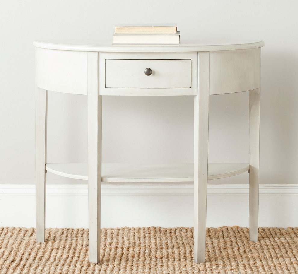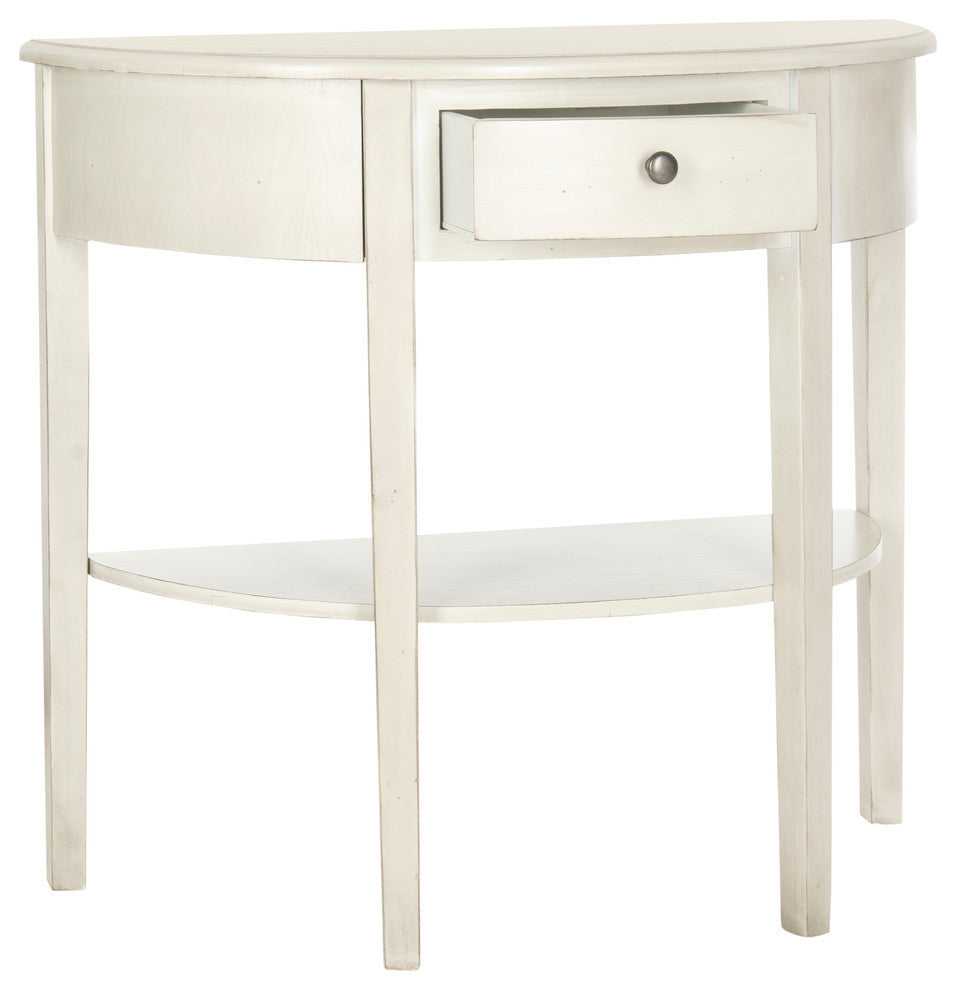 Brighten an entry hall or living room with the country casual Abram console from Safavieh. Crafted of poplar in a shabby chic eggshell finish, this demilune console has a handy drawer for gloves and keys and shelf for collectibles or magazines. The straightforward lines of this table make it a transitional complement to many decorating styles.Care Instructions: Wood is a natural material with variations of color shade, configuration, streaks, and grain structure. Each individual piece of Safavieh furniture has characteristic markings that will differ from photo and showroom samples. Regular attention and maintenance of fine furniture can ensure its beauty for years to come. Always use felt pads under all articles to prevent discoloration or softening of the lacquer. Plastic and rubber bases on items can discolor wood.Item Dimensions: 33.9" W x 14.4" D x 30.1"H