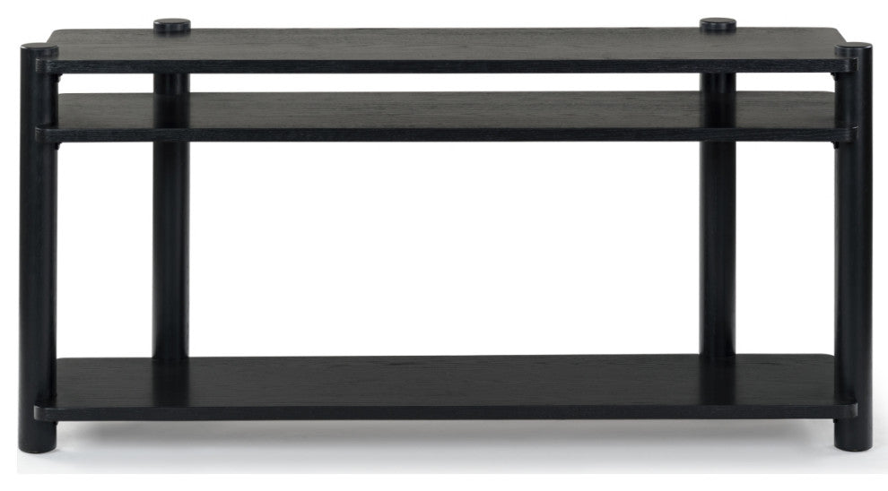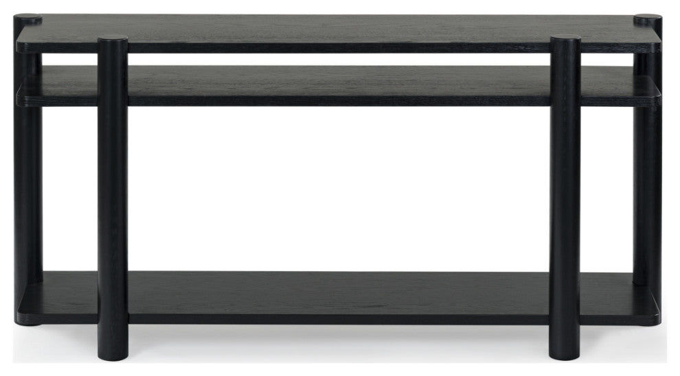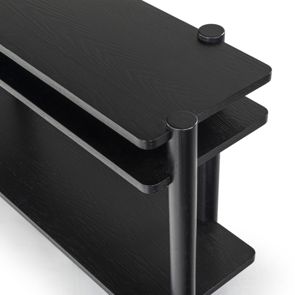 Introducing the Edisyn 3 Shelf Wood Console Table - a fresh addition to your living space, reflecting refined elegance and sophistication. Embodying the sheer brilliance of aesthetics and function, our console table is the ideal piece of furniture to complement your home decor. Unveiled in a luxurious black color, this console table represents a timeless blend of design and practicality. Constructed from robust solid rubberwood, oak veneer and manufactured wood, it is given a durable finish to enhance its charm and versatility. With 3 shelves providing ample storage, the table is aesthetically appealing and practical, offering perfect dimensions to flaunt your collectibles or organize your favorite books. The Edisyn 3 Shelf Wood Console Table is a nod to classic design sensibilities, cleverly put together to stand as a functional piece of furniture. It has a unique charm with a nod towards modern design, making it a stunning addition to any corner of your home. Come, make a sophisticated statement with our Edisyn 3 Shelf Wood Console Table and give your living space a new lease of life, cherishing moments of style and class today and many more days to come. Embrace the grandeur of superior craftsmanship and magnificent design that differentiates your living space. The elegance of black paired with the charm of solid wood ensures that the Edisyn 3 Shelf Wood Console Table will be an integral piece in your living space, enhancing the overall look and feel.