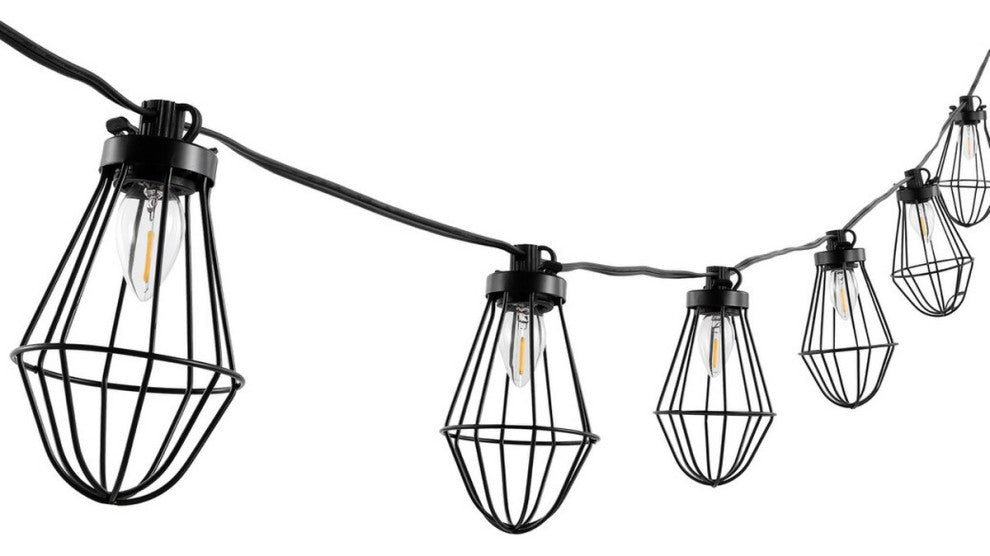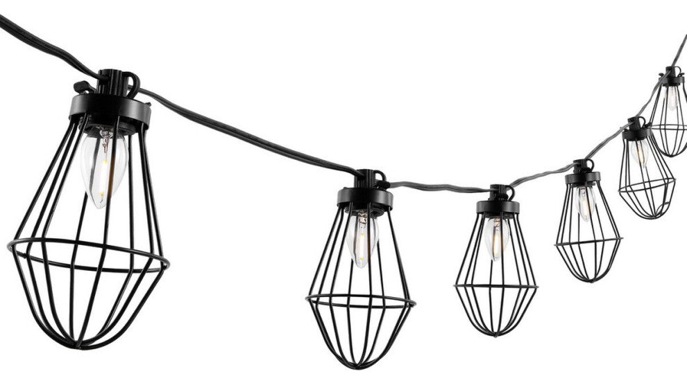 These eclectic Ellina LED Outdoor String Lights were designed for those who desire a unique, artistic touch to their outdoor decor. Ellina''s ten industrial birdcage-style shades mimic the shape of Victorian streetlamps, giving new life to the classic design with a touch of sass.