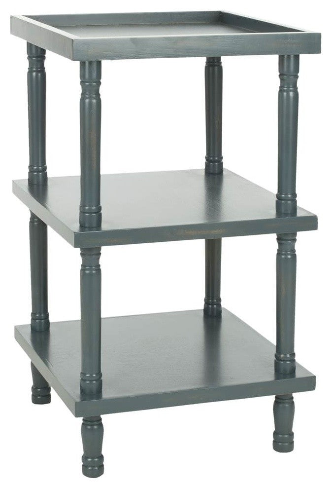 Tiered and true. The Esmeralda Side Table speaks to the twenty-first century traditionalist. Crafted with pine wood, its dark teal finish and clean lines are perfect for showcasing books, photos and vintage treasures. Care Instructions: Wood is a natural material with variations of color shade, configuration, streaks, and grain structure. Each individual piece of Safavieh furniture has characteristic markings that will differ from photo and showroom samples. Regular attention and maintenance of fine furniture can ensure its beauty for years to come. Always use felt pads under all articles to prevent discoloration or softening of the lacquer. Plastic and rubber bases on items can discolor wood. Item Dimensions: 18.25" W X 18.25" D X 32.25"H