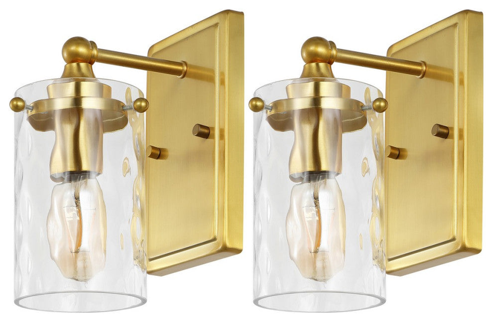 Step up your wall decor with the sophisticated charm of our Jobie wall sconces. The elevated details and streamlined profile of our wall scones blend modern and traditional sensibilities to perfection. A rectangular bevelled back plate and beautifully stylized arms lend a stately presence to our wall scones. It features sleek cylindrical shades to achieve a timelessly modern look. Each glass shade is textured to diffuse a soft ambient glow. Showcasing a gleaming brass finish, our wall scone can be styled on either side of a bed, fireplace, or mirror to add a perfect touch of polish to your home.