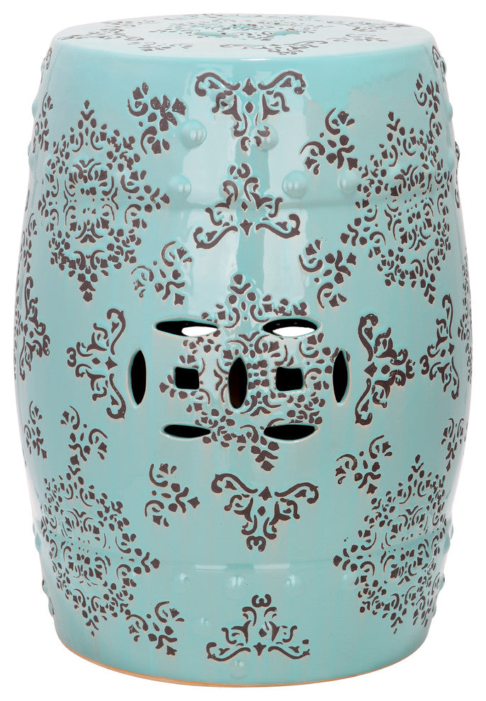 Adorned with lacy motifs adapted from Chinese silk brocade, the Medallion Garden Stool adds international flair to both indoor and outdoor spaces. With soft grey florals on its robin''s egg blue ceramic, Medallion is great in pairs or by itself as a striking decorative centerpiece.•Materials: Ceramic•Finish Surface Treatment: Glazed•Dimensions: 13" W X 13" D X 18.5" H•Weight: 15.4 lbs•Weight Capacity: 195 lbs•Base Hollow Opening: 5.5"