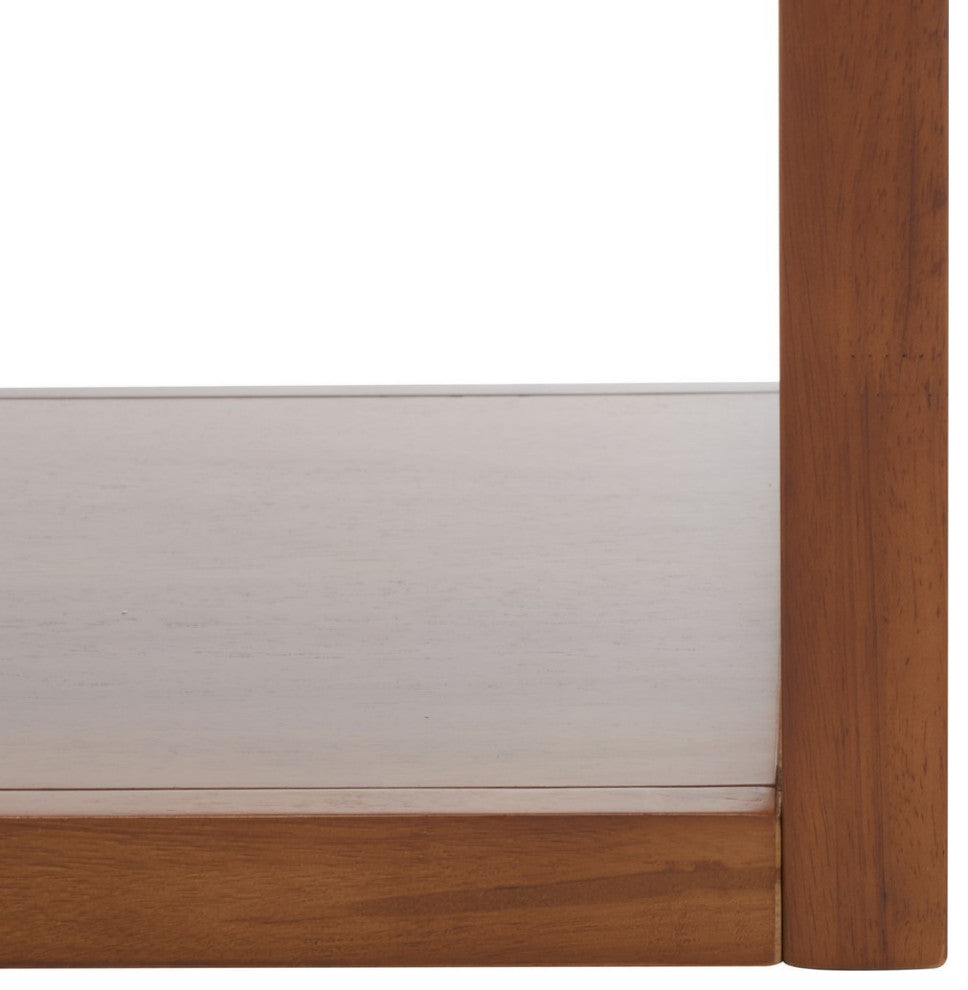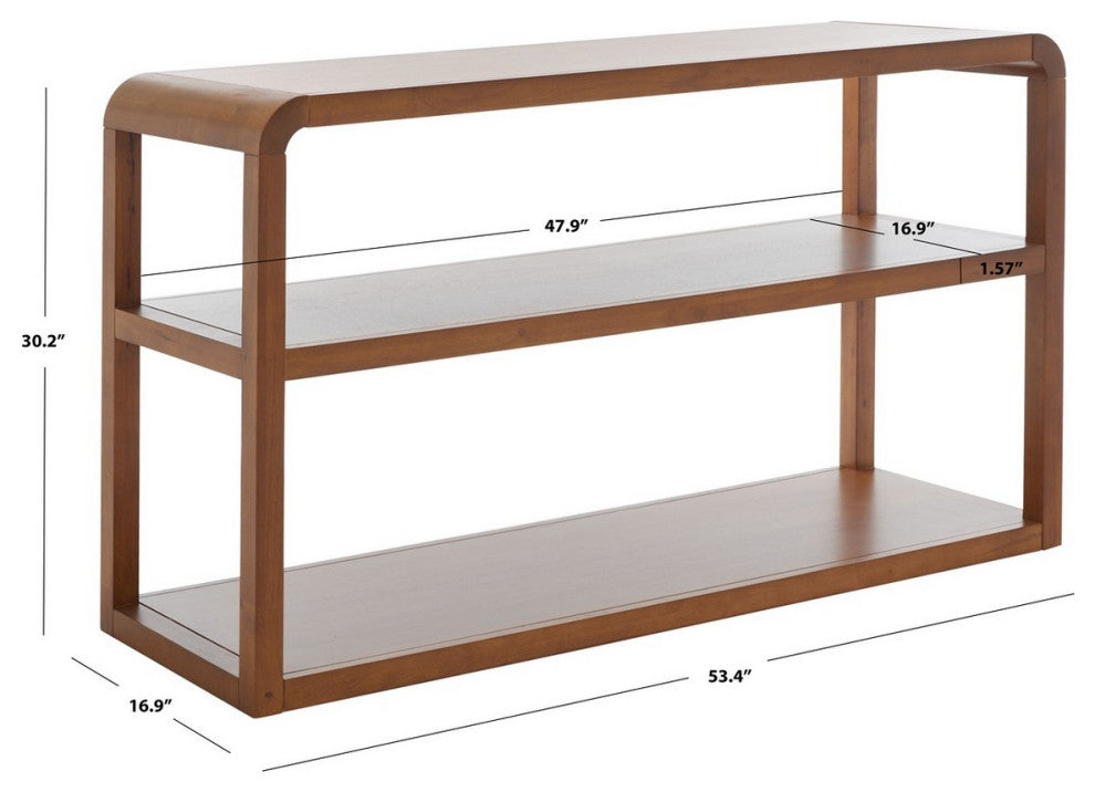 Uplift your home with the modern charm and elegance of our Omara console table. The refined and streamlined design of the console table is accentuated by curved edges and slender legs. Crafted with solid wood in a sleek walnut finish, our console table lends an elegant and effortless touch to any corner. It features three tiers to maximize space for both display and storage, to feature as a versatile sofa or entryway table, or even a minibar or buffet.