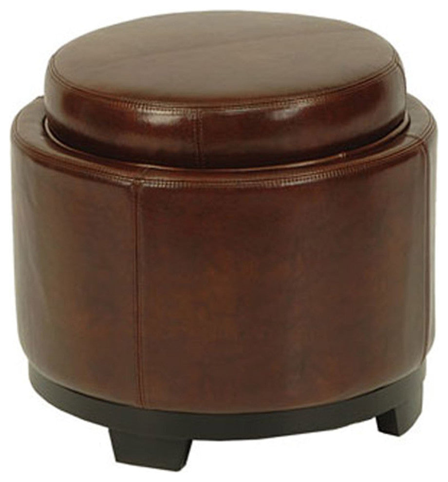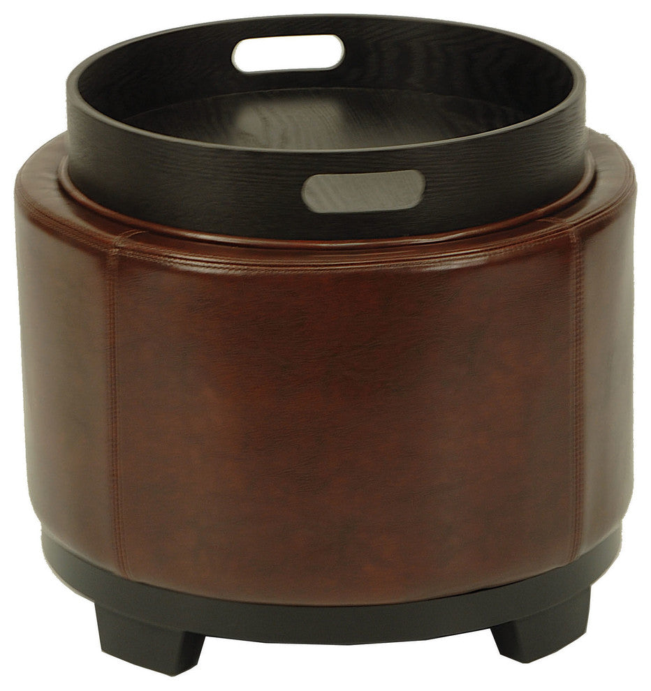 Geometry in motion. The Round Storage Tray Ottoman brings three times the charm to any room. Beneath striking cordovan bicast leather upholstery, a soft foam cushion offers extra seating and performs butler duty when reversed to a handy serving tray. Perfect for any room of the house, this ottoman stands on birch wood legs in chic black finish. It''s a classic piece for storing throws, magazines or TV paraphernalia.