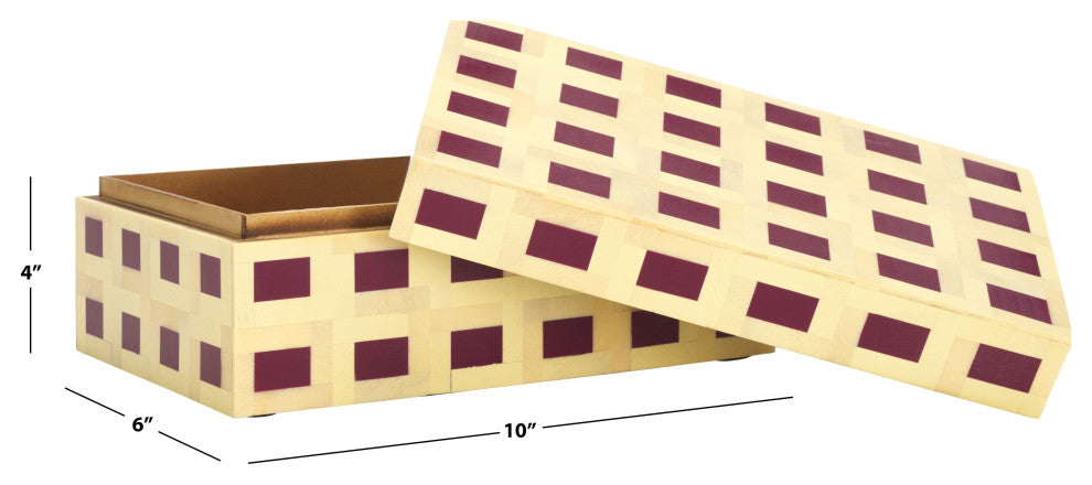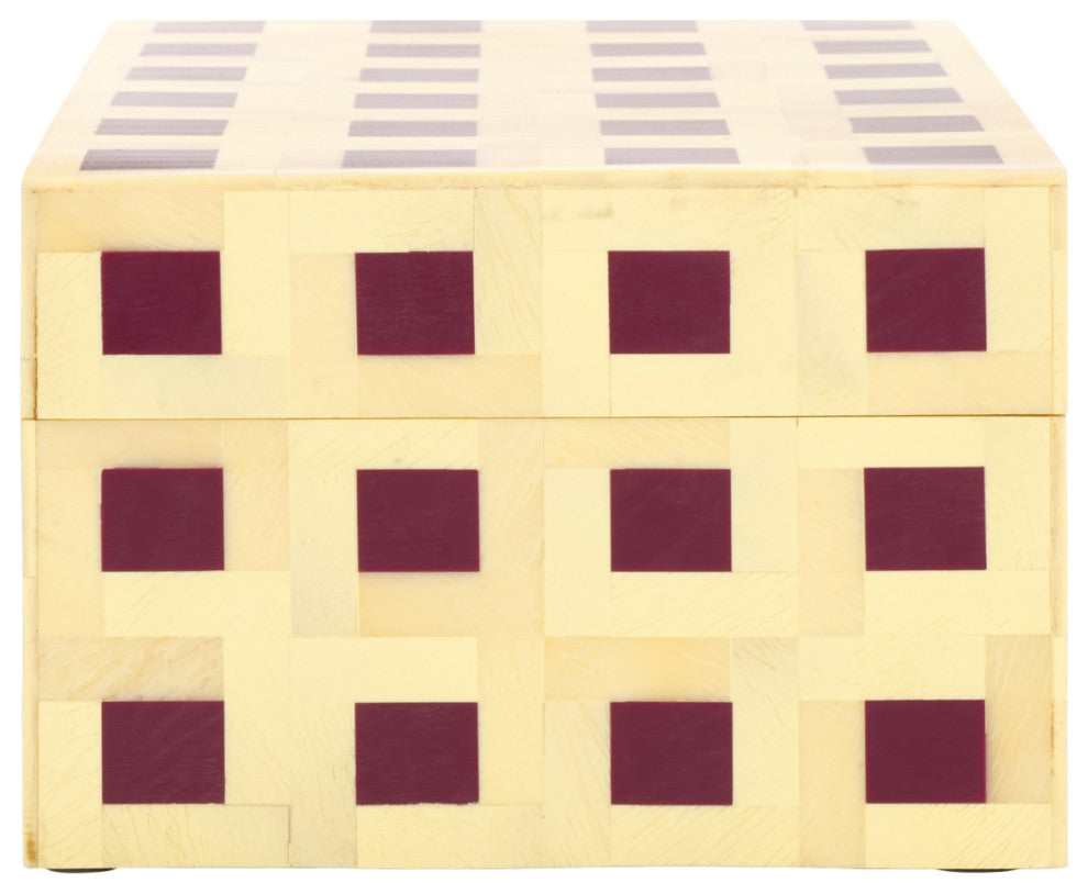 Introducing the Sati Decor Box Set of 2, a duo designed to elevate your room''s aesthetic with its sophisticated muted yellow and burgundy color palette. Crafted from a blend of resin and MDF, this set combines sleek design with practicality.The visually intriguing red square inlays set against a faux wood pattern create a captivating optical effect, adding a modern twist to the classic box silhouette. These boxes are designed to be both stackable and nestable, providing versatile storage options while enhancing your decor. Whether used for storage or as stand-alone decorative pieces, they offer style and functionality for any setting.The distinctive craftsmanship and attractive color scheme make these boxes a harmonious addition to both contemporary and traditional decors. Revamp your space with the Sati Decor Box Set, where functionality meets artful design, and let the muted yellow and burgundy hues bring warmth and sophistication to your home.Size 1 Dimension: 9"x6"x3.5"Size 2 Dimension: 6"x4"x2.5"